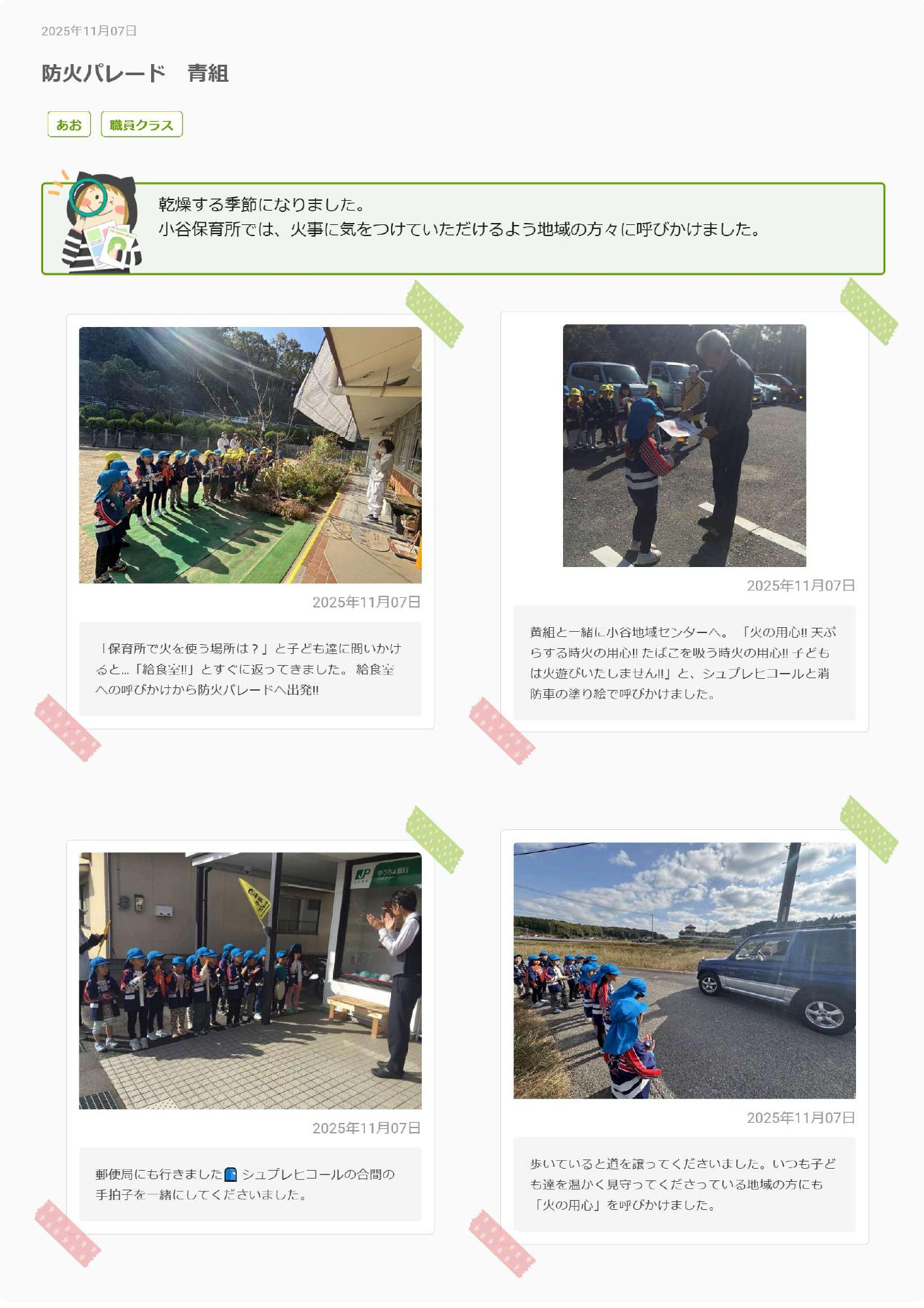 火災が発生しやすい時期になり地域の方々に防火への意識を高めてもらうため本日、防火パレードを行いました。 「火の用心 天ぷらするとき火の用心 たばこを吸うとき火の用心 子どもは火遊びいたしません」と、地域の方々に呼びかけ、ぬりえを配りました。 寒くなり、空気も乾燥してくるため、火の元には十分気をつけていきたいですね。