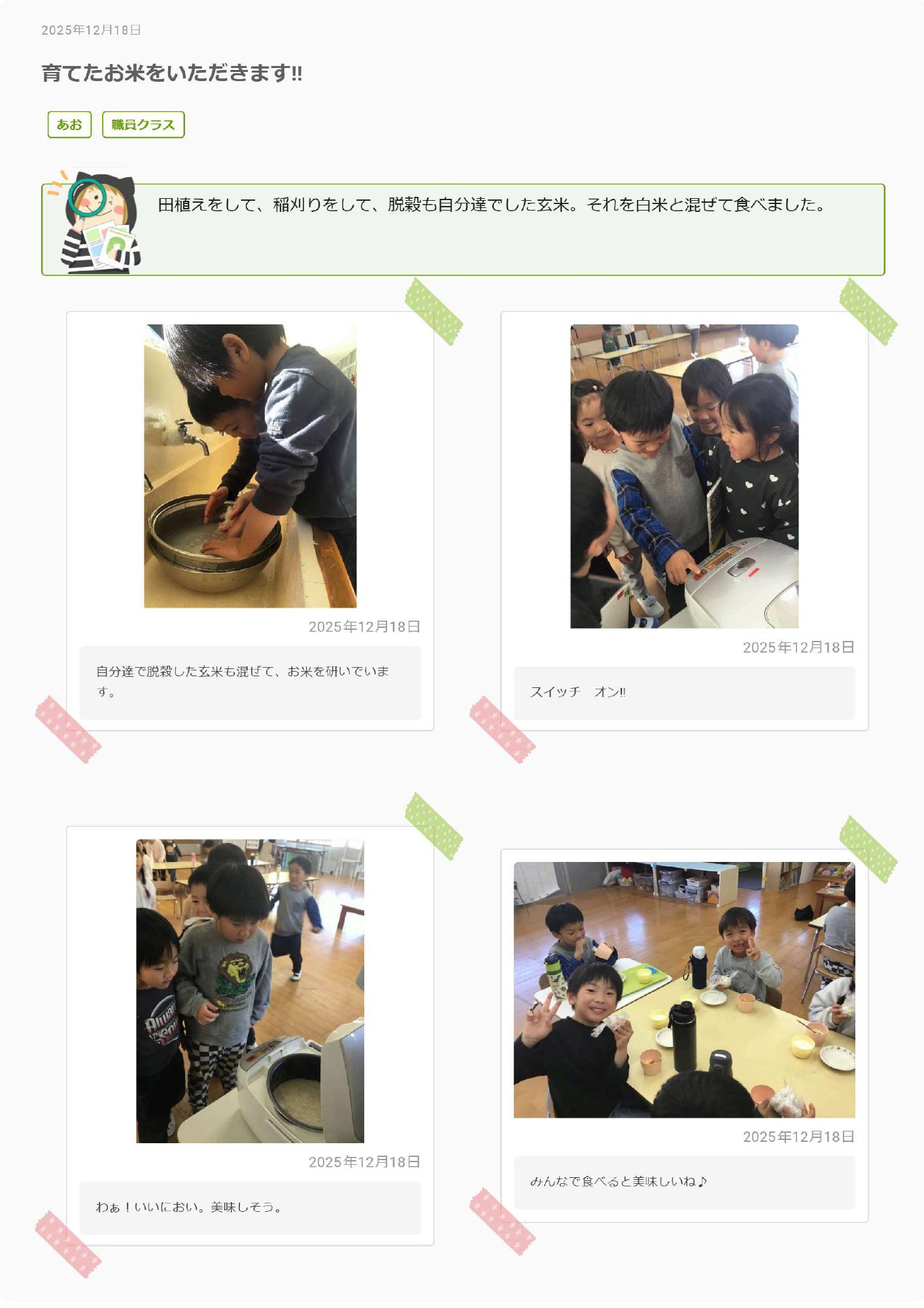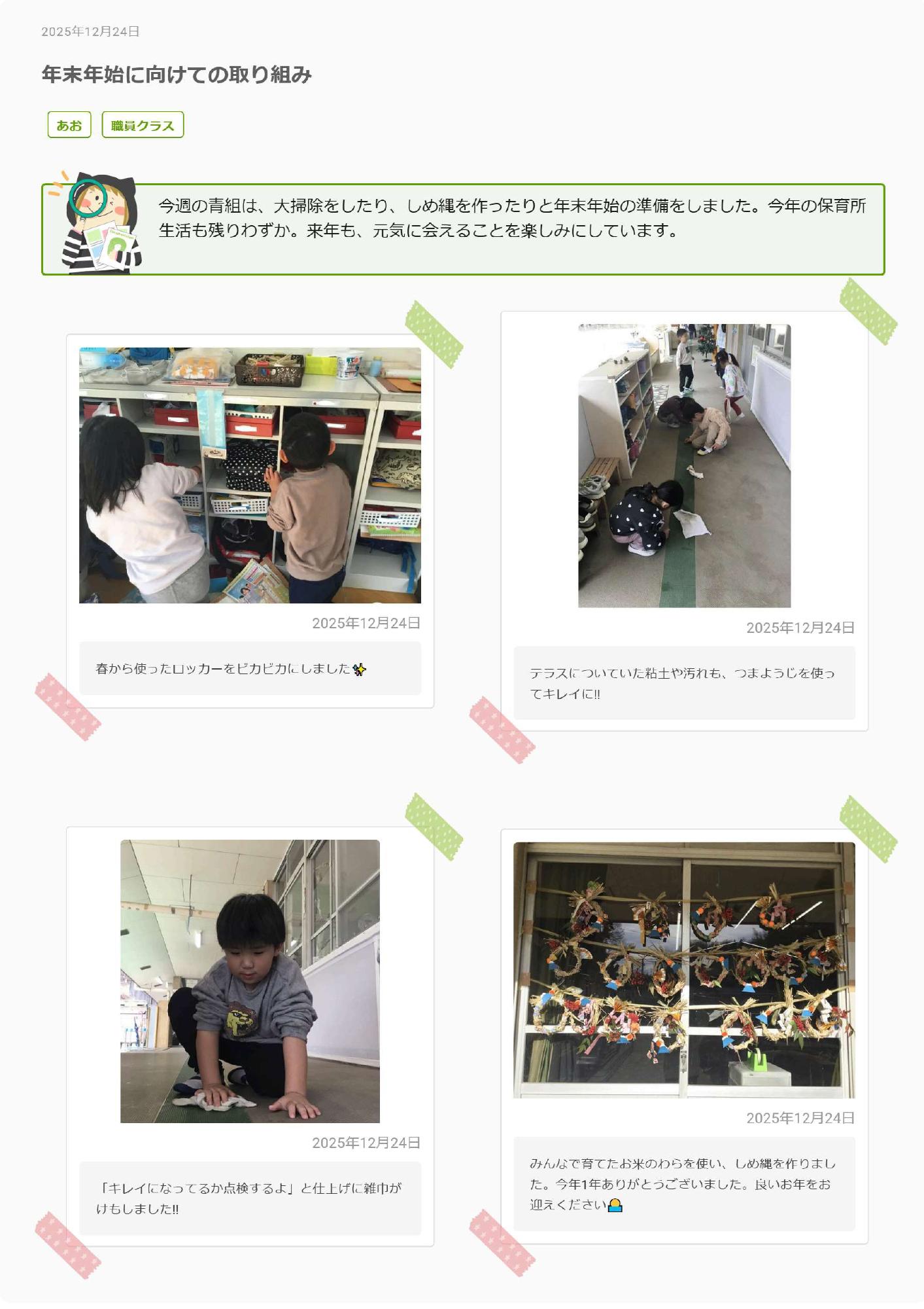 先週火曜日は、ステキな卒園式でした。15人みんなで笑顔で卒園できたことがとても嬉しかったです。たくさんのご協力、そして温かく見守ってくださり、ありがとうございました。卒園後は次の青組さんに掃除の仕方などを伝えています。去年の青組さんがしてくれたように、優しく、丁寧に伝える姿みると、改めて成長感じることができます。とてもステキなお兄さんお姉さんです。
