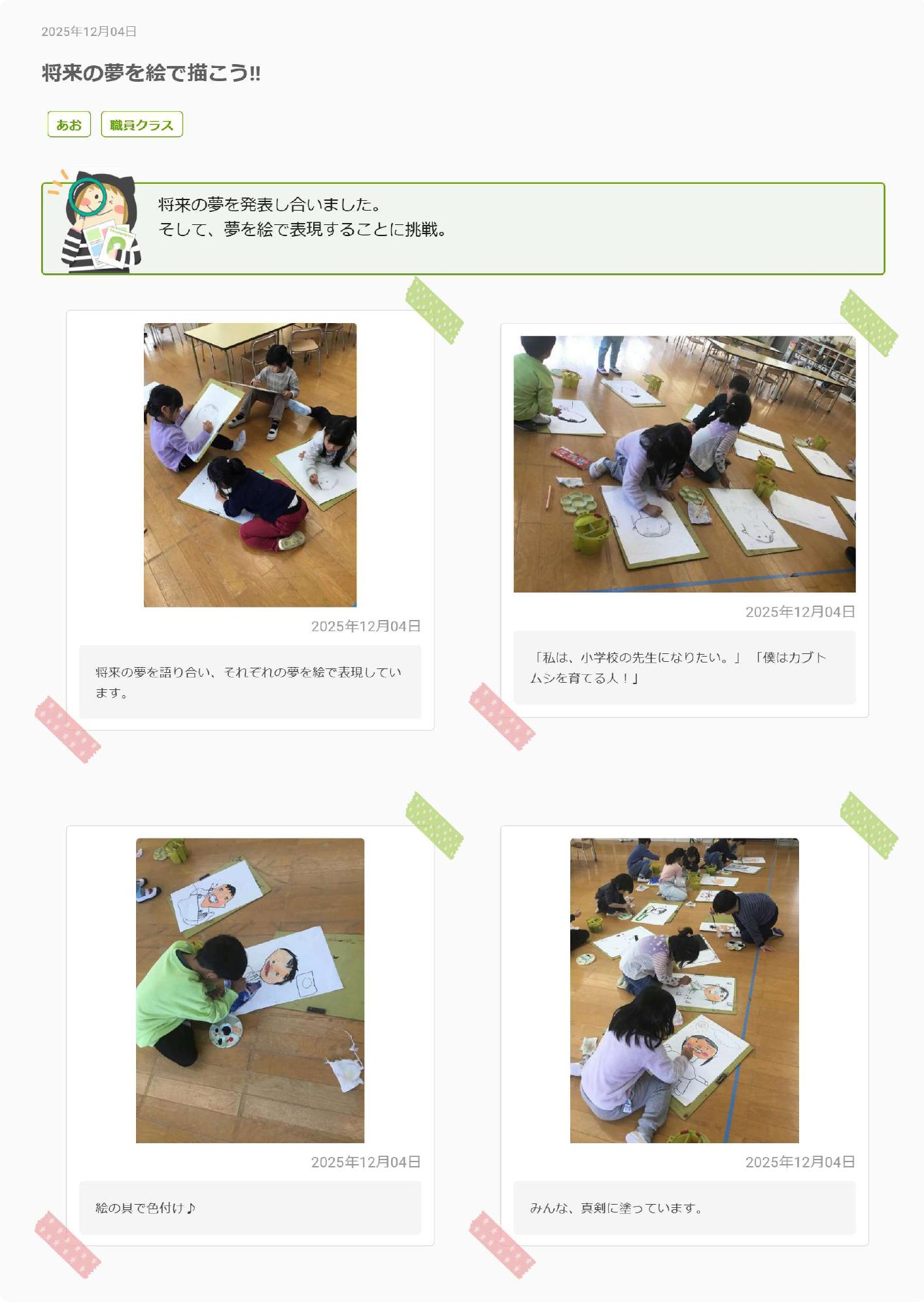 今青組では、ダンボールで家を作ってなりきり遊びを楽しんだり、自分オリジナルの絵を描いたり、折り紙や廃材で作って遊ぶことを楽しんでいます。それぞれが自分の思いや考えを十分に発揮し、思いきり遊びを楽しんでいます。これからどんなふうに遊びが広がっていくか、とても楽しみです。