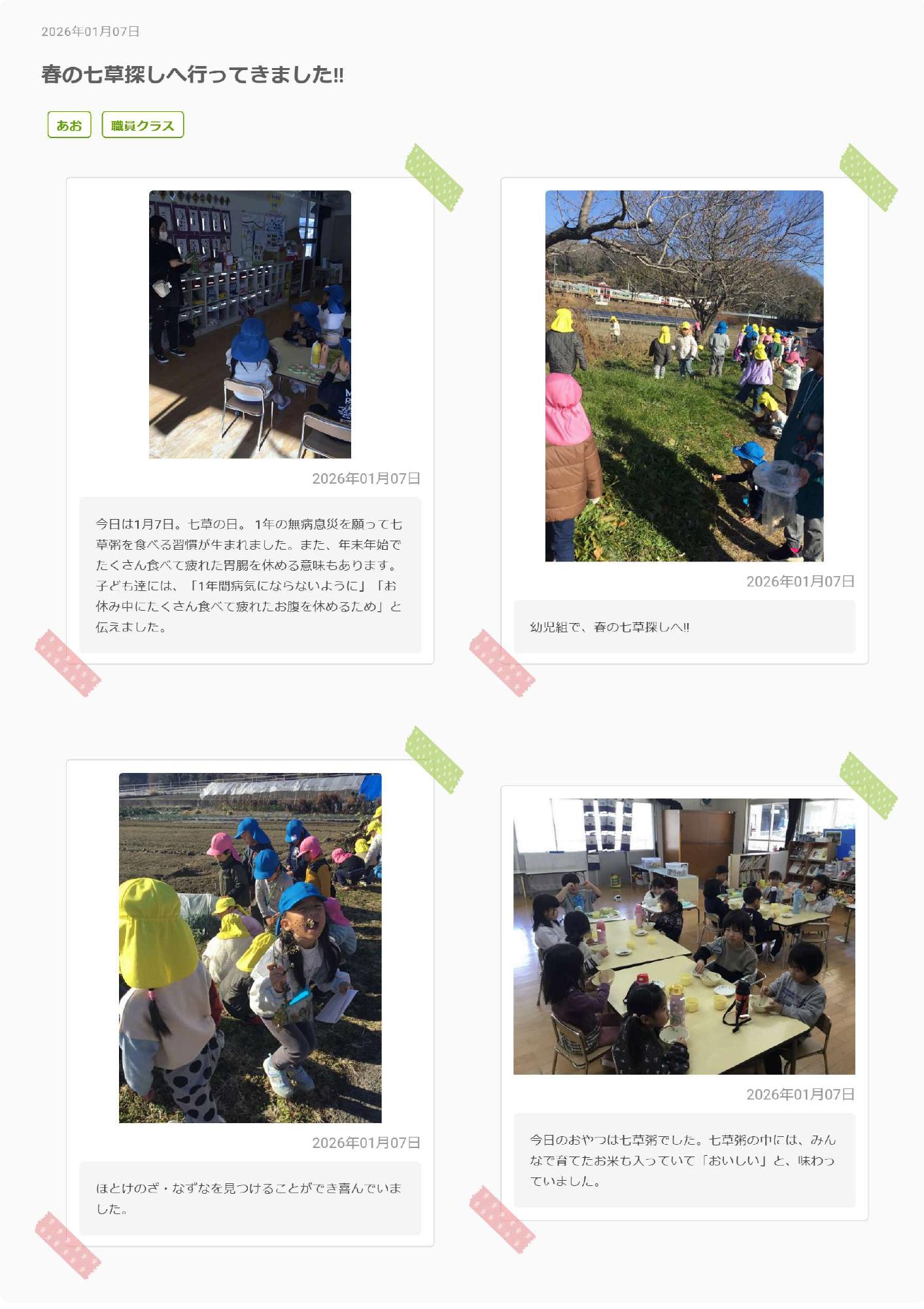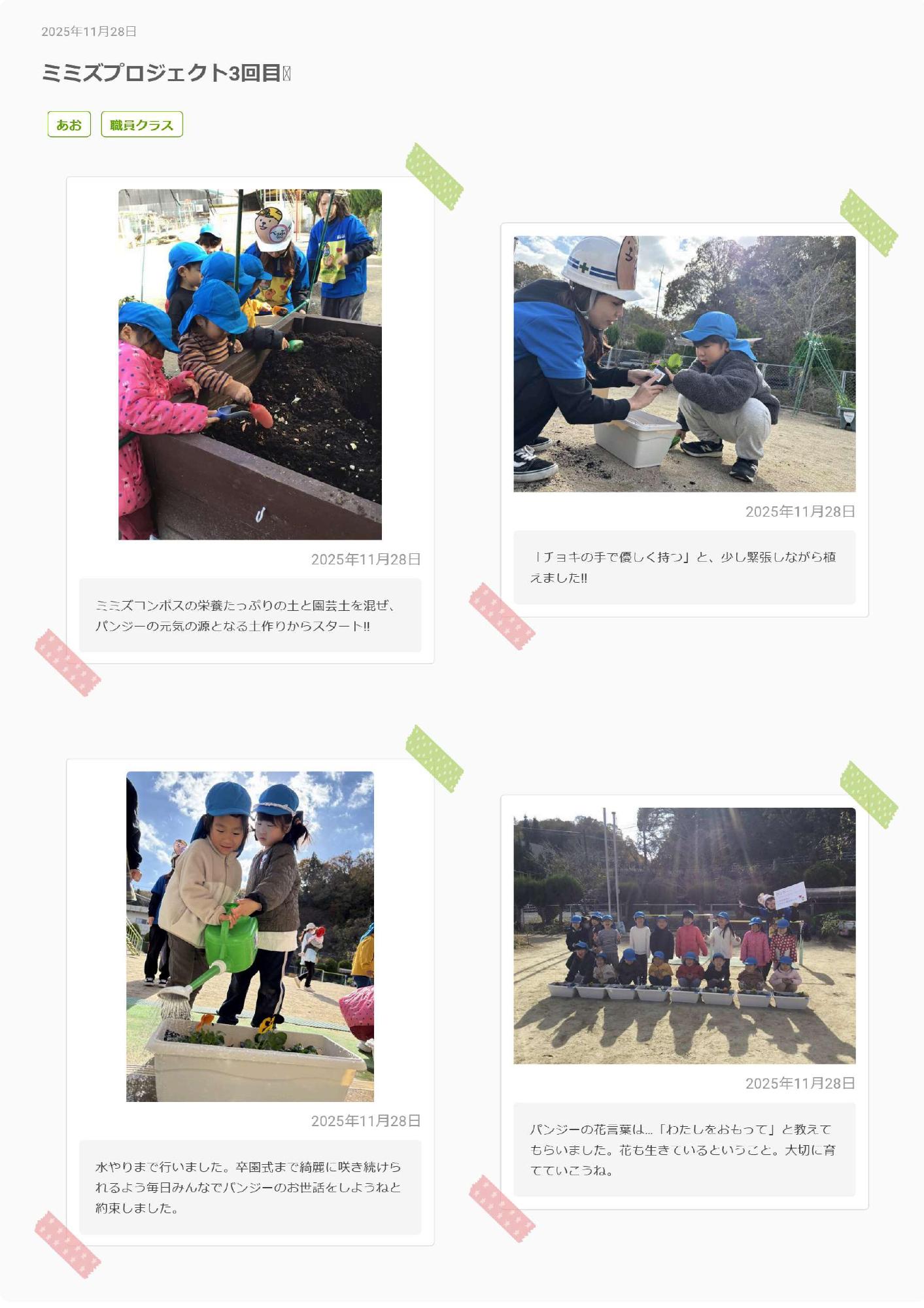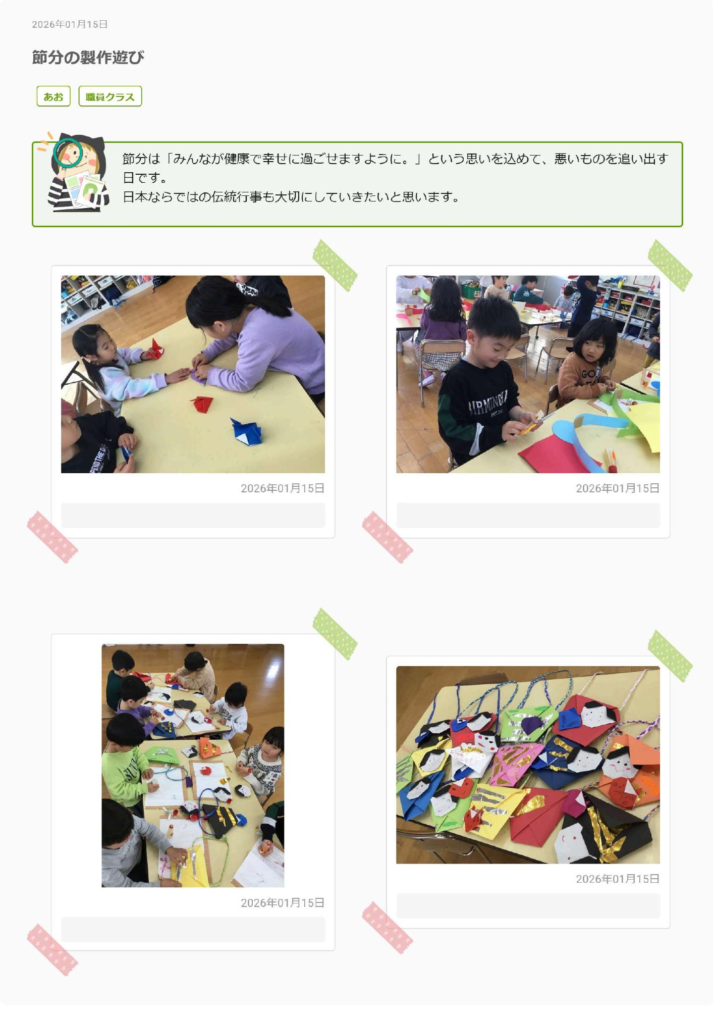 青組が始まり、1週間が過ぎました。子どもたちは青組になれたことが嬉しくて、毎日笑顔いっぱいに過ごしています。今週は元気に外で遊んだり、春を探しに散歩に出かけたり、制作を楽しんだりと、様々なことを経験しました。今後も色々なことを経験し、楽しく過ごしていきたいと思います。