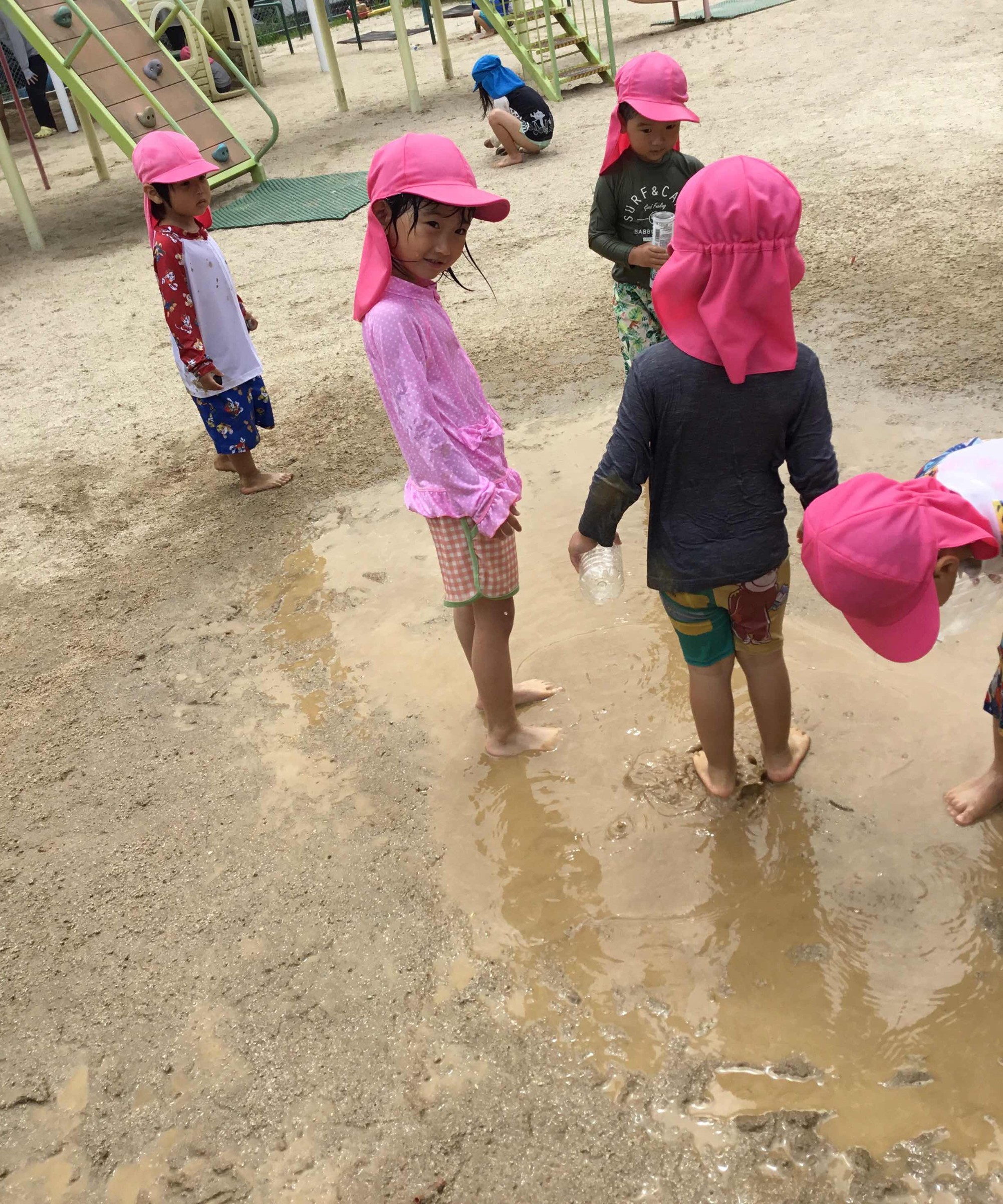 今週から水遊びが始まりました。子どもたちは、「早く水遊びがしたい!」と楽しみにしていました。 水や泥を触ったり、水を浴びたり、泥を足で踏んだり、と全身で水や泥の感触を味わいました。水溜まりに手を入れて「泥気持ちいい」と、気持ち良さを教えてくれました。 これからもっと暑くなるので、シャワーで汗を流してサッパリ、気持ちの良い日々を過ごしていけたらと思います。