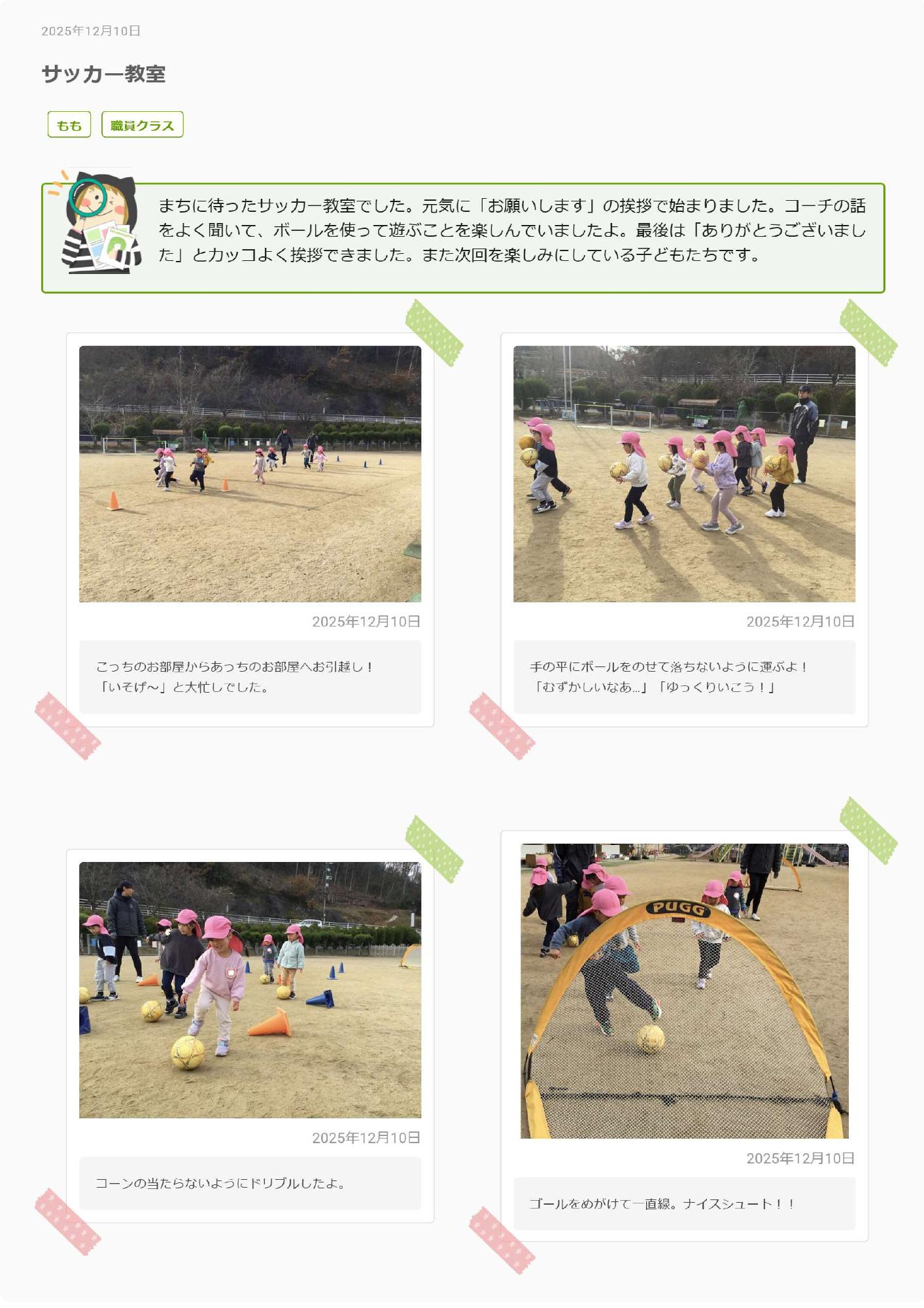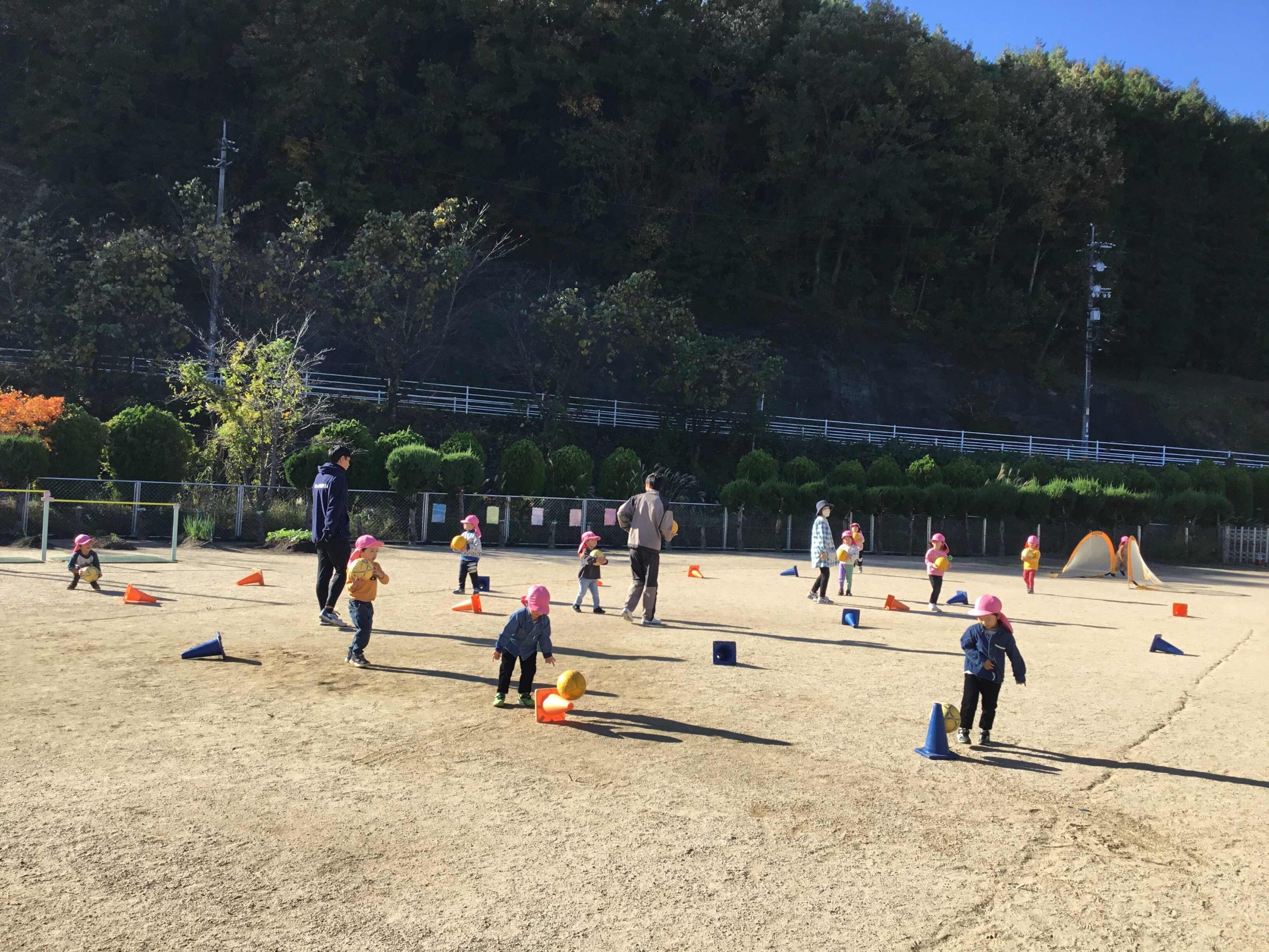 サッカー教室がありました。 カラーコーンを使った楽しいアップ練習や「ボールとお友達になろう」とボールを使った遊びなど、楽しみながら身体を動かしました。最後に、サッカー風に足だけでボールをとり合うルールで、みんなで遊びました。 「サッカー楽しい!」とサッカーに興味を持ち始めている子どももいます。