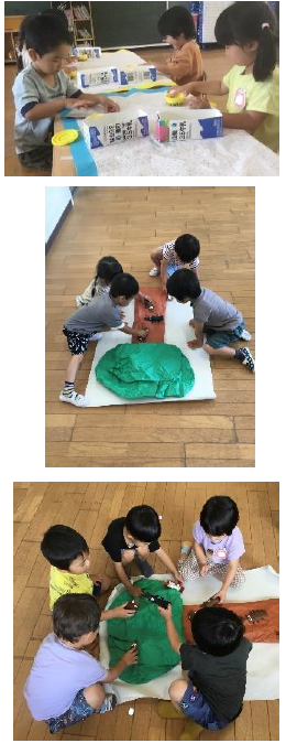 いよいよ来週は、発表会です。おうちに帰ってもセリフを言ったりして楽しんでいる様子を聞いたり、発表会で歌う歌を歌いながら帰っていく子どもたちの姿を見ると、楽しみにしている様子が伺えます。 今週は初めて他クラスのお友達の前で発表し、緊張していた子どもたちですが、本番が近づいていることを実感してきているようです。保育室に戻っても「〇〇の曲流して〜」とリクエスト。生き物に変身し、曲に合わせて身体を動かすことを楽しんでいます。