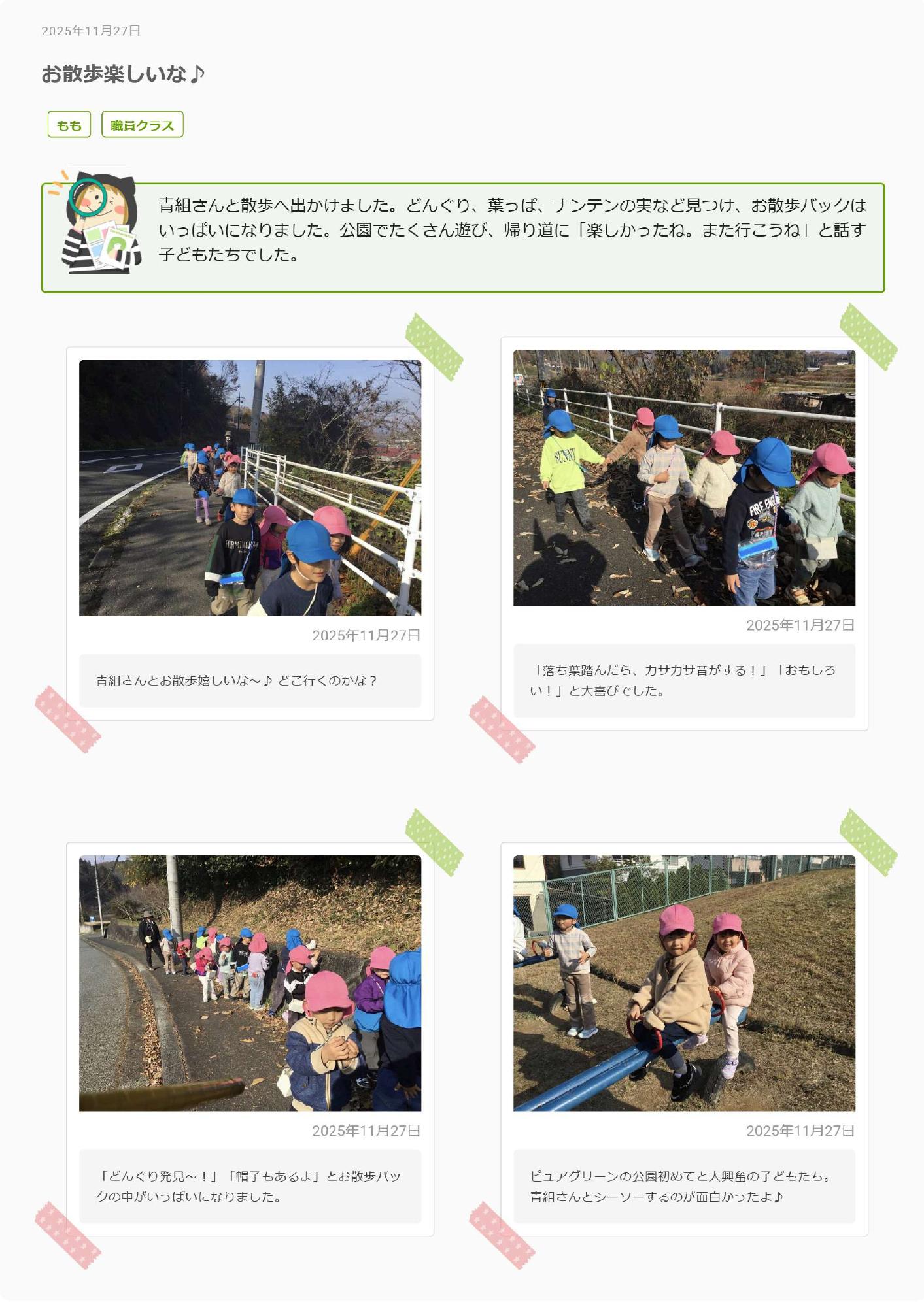 今週は、おおぞら台の公園までお散歩に行ってきました。この日は、交通安全指導があり、交通ルールを学んでから、青組と一緒に安全に気をつけながら歩きました。 きれいな色の落ち葉や、栗、どんぐり、松ぼっくりなど、たくさん秋を見つけました。みんなで松ぼっくりを拾っていると、「松ぼっくりはお猿が食べるんよ」と、子どもたちのかわいい会話が聞こえてきました。