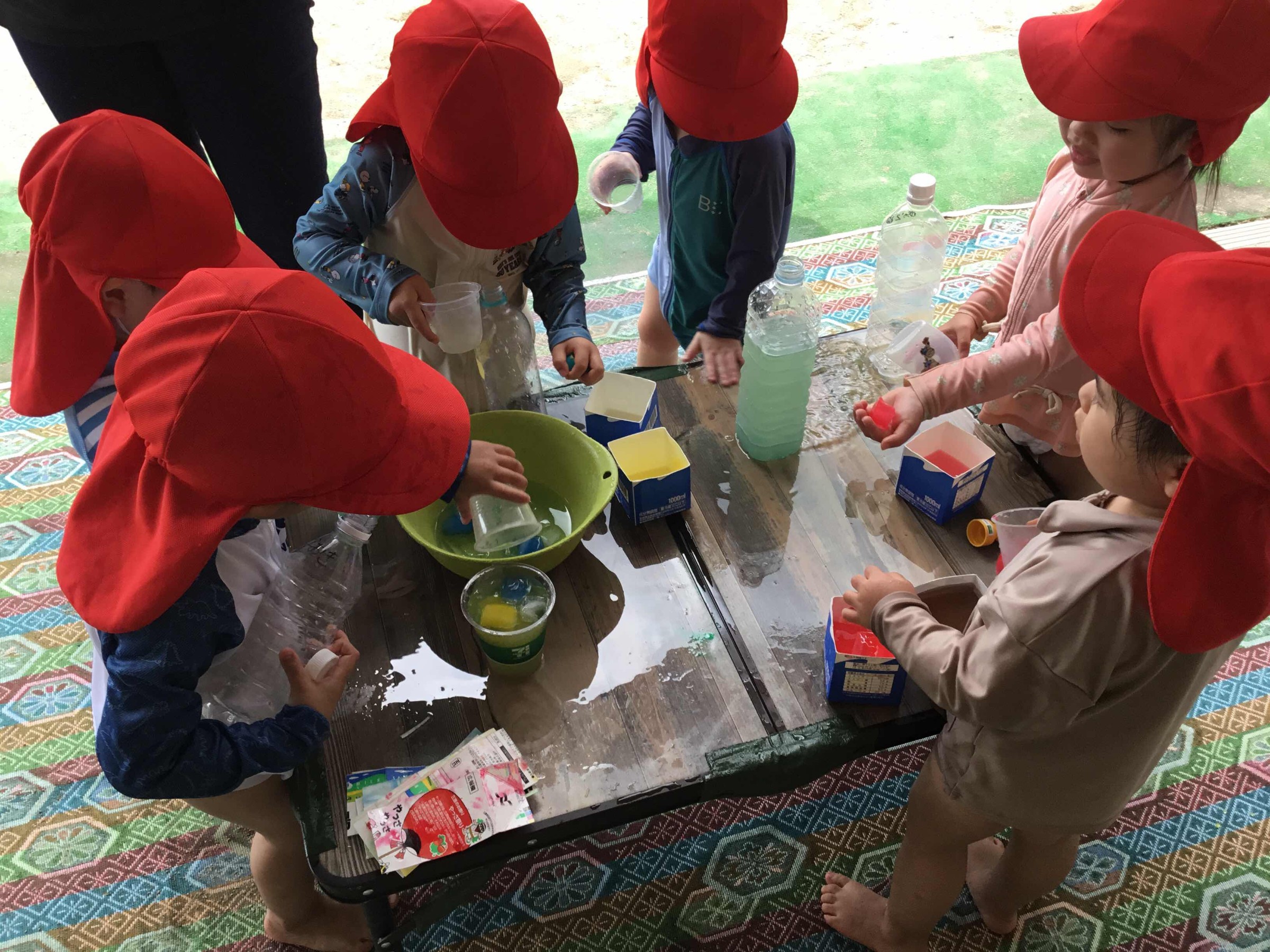 今週は寒天遊びを楽しみました。牛乳パックの中からツルンッと出てきたカラフルな寒天に「わあ〜!」と嬉しそうな子どもたち。さっそく握ったり、潰したり、スプーンですくったり…。くずれた寒天はキラキラ!それに気づいた子どもたちはカップに集め、うれしそうな笑顔でした!一人ひとり、指先を使って寒天の冷たさや気持ちよさなどを味わいました。