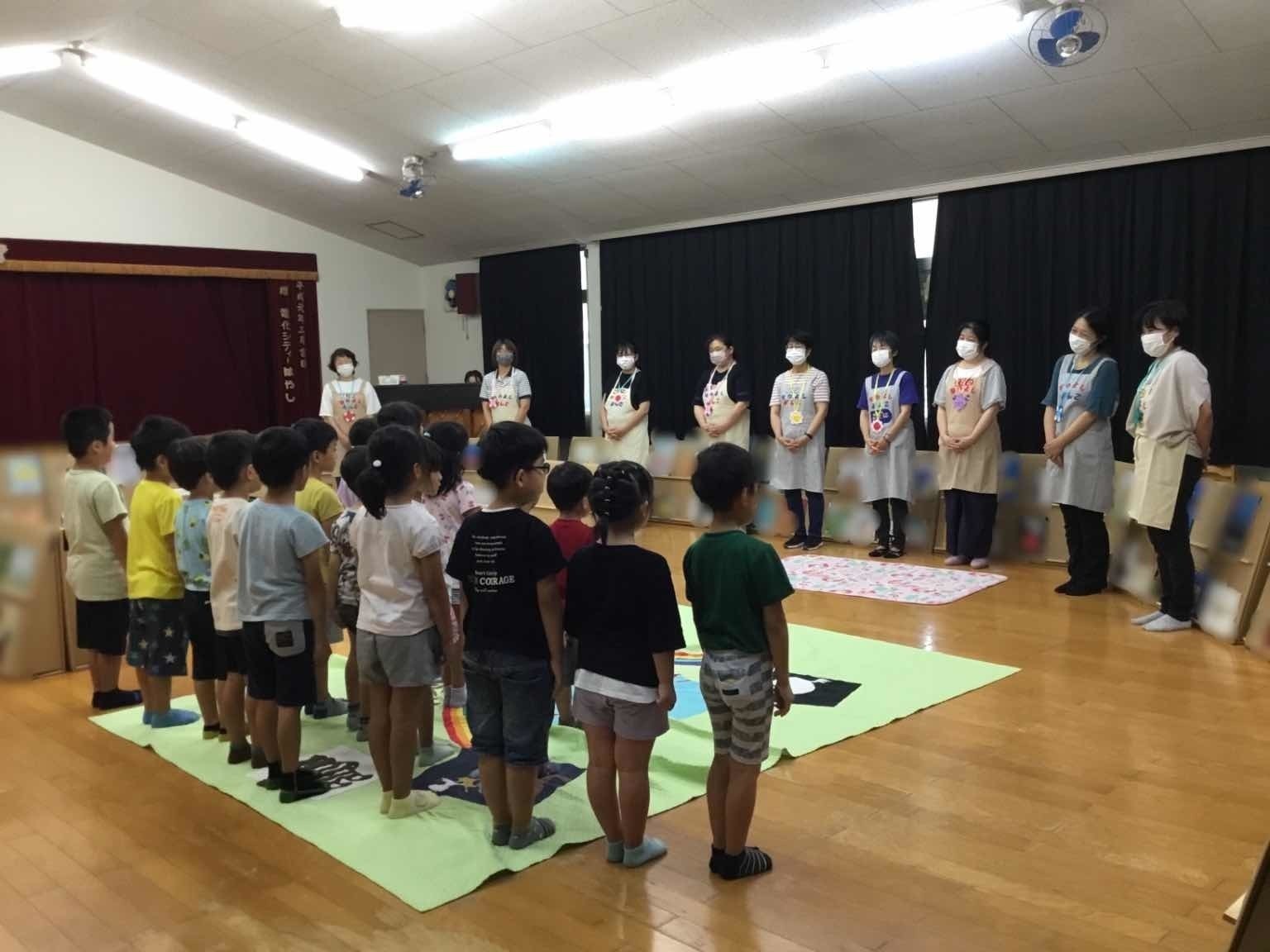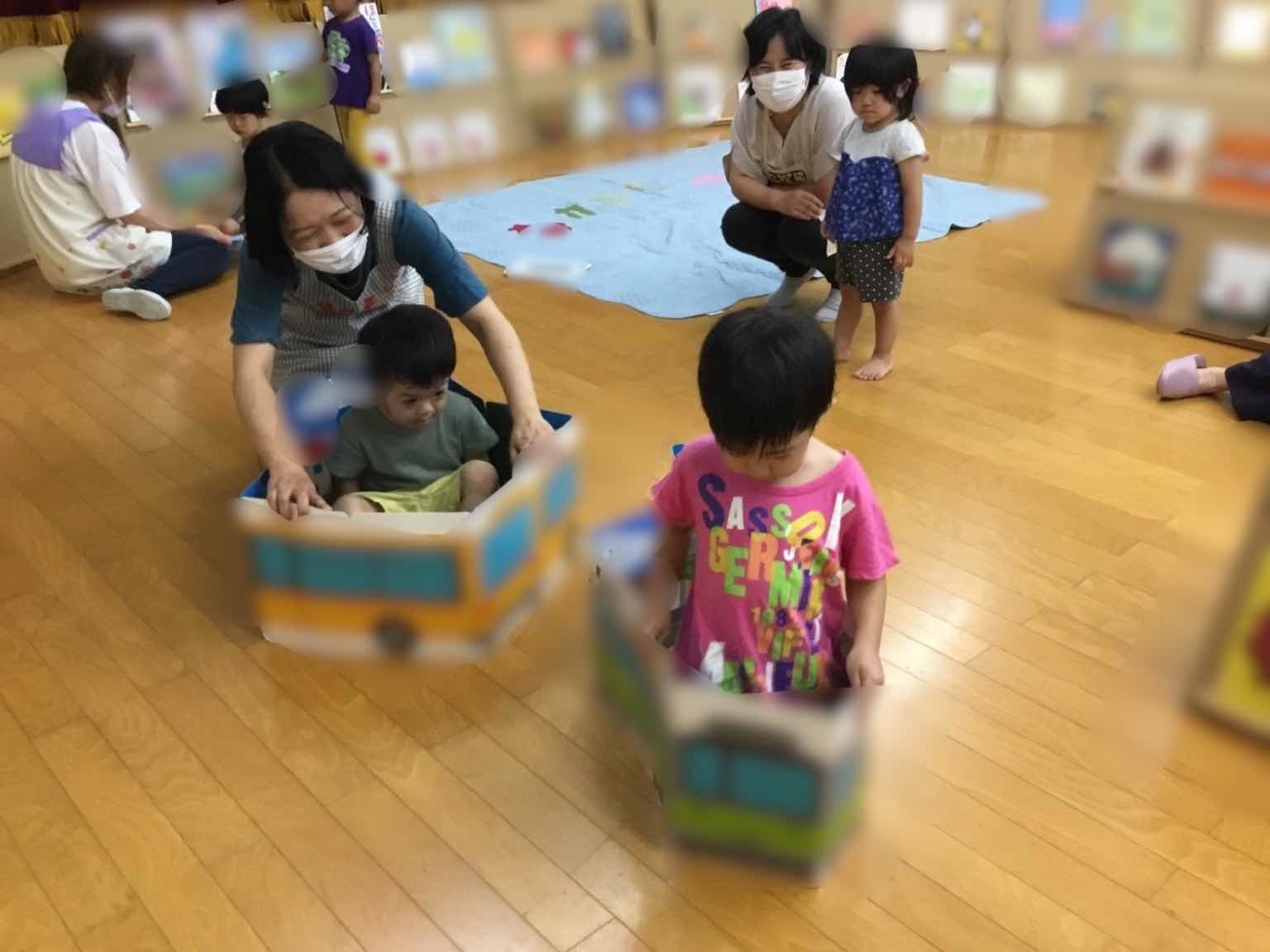 小谷なかよし文庫さんが、お話し会を開いてくださいました。 「さんぽ」の音楽に連れられて、ホールに集まった子どもたち。「なにがはじまるのかな」と、ワクワクした表情を浮かべていました。「わらうとまけよ、あっぷっぷ!」と、絵本の中のだるまさんとにらめっこをしたり、「まんまるまんま、たんたかたーん!」と呪文を唱えたり、みんなで楽しい時間を過ごしました。 カエルの絵本にちなんで、ぴょんぴょんカエルのプレゼントをいただきました。お部屋に帰って、さっそく遊んでいた青組。「とんだ!」と、みんなで盛り上がりました。