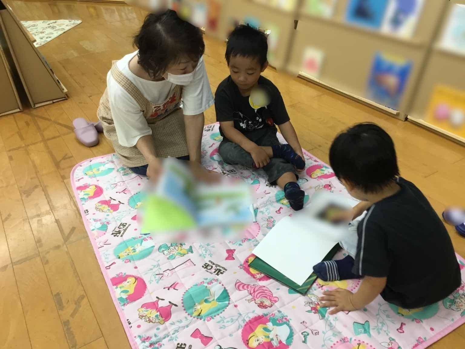 今日はなかよし文庫さんが、たくさんの絵本を保育所に持って来てくださり、遊戯室が図書館に変身しました!! 好きな絵本を選んでなかよし文庫さんに読み聞かせをしてもらう子、友だちと一緒に絵本を見て「おもしろいね!」と共感し合う子・・・楽しそうな子ども達の姿が見られました。 なかよし文庫さんから、赤・桃組へ折り紙の吹きコマ、黄・青組へ手作りキーフォルダーのプレゼントもいただきました。保育所からは青組が歌と手作りペンダントのお礼をしました。 ゆったりとした雰囲気の中、たくさんの絵本に囲まれて楽しい時間を過ごすことが出来ました。来月は、お話の会があります。またなかよし文庫さんに読み聞かせしていただくことが楽しみな子ども達です。