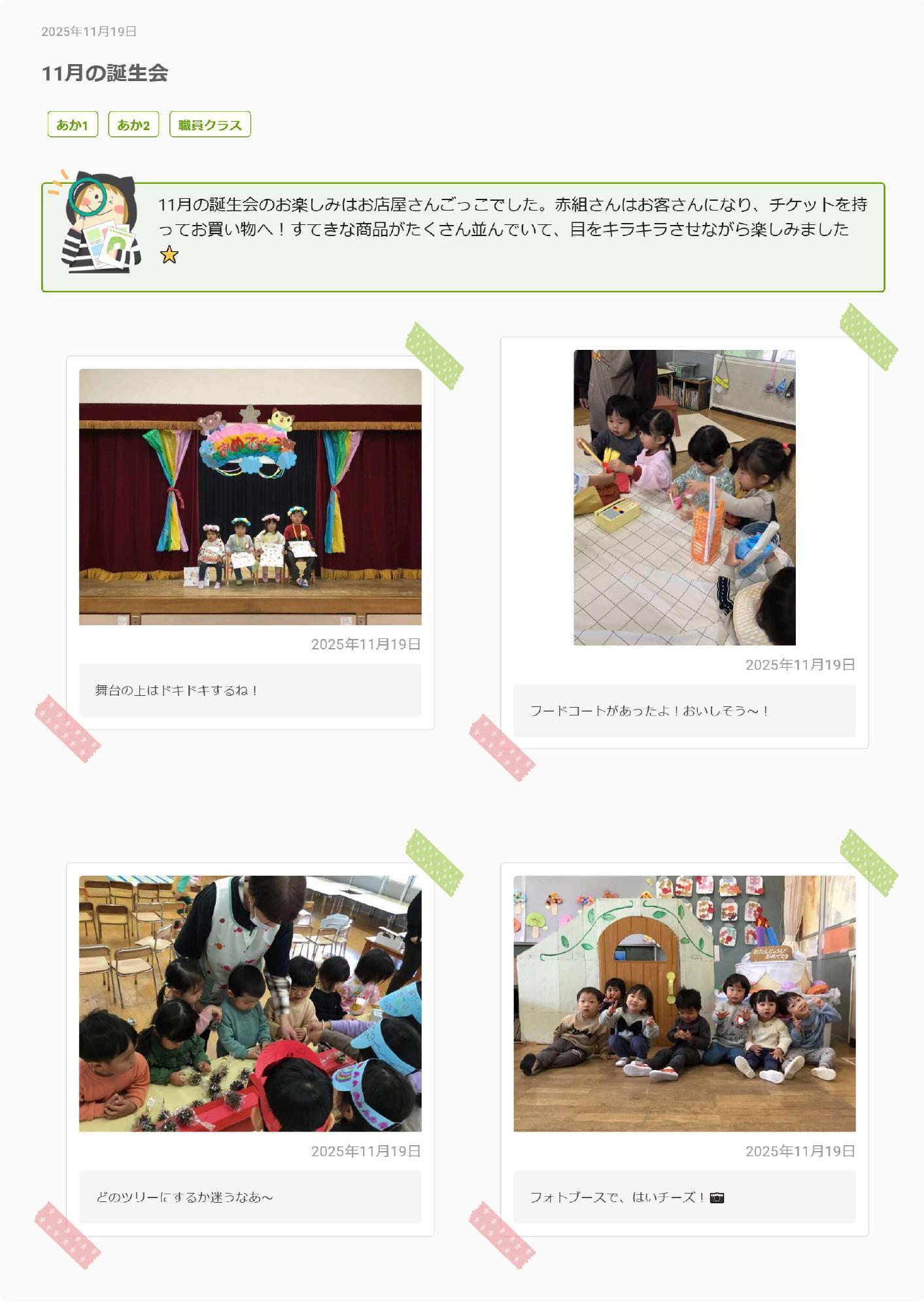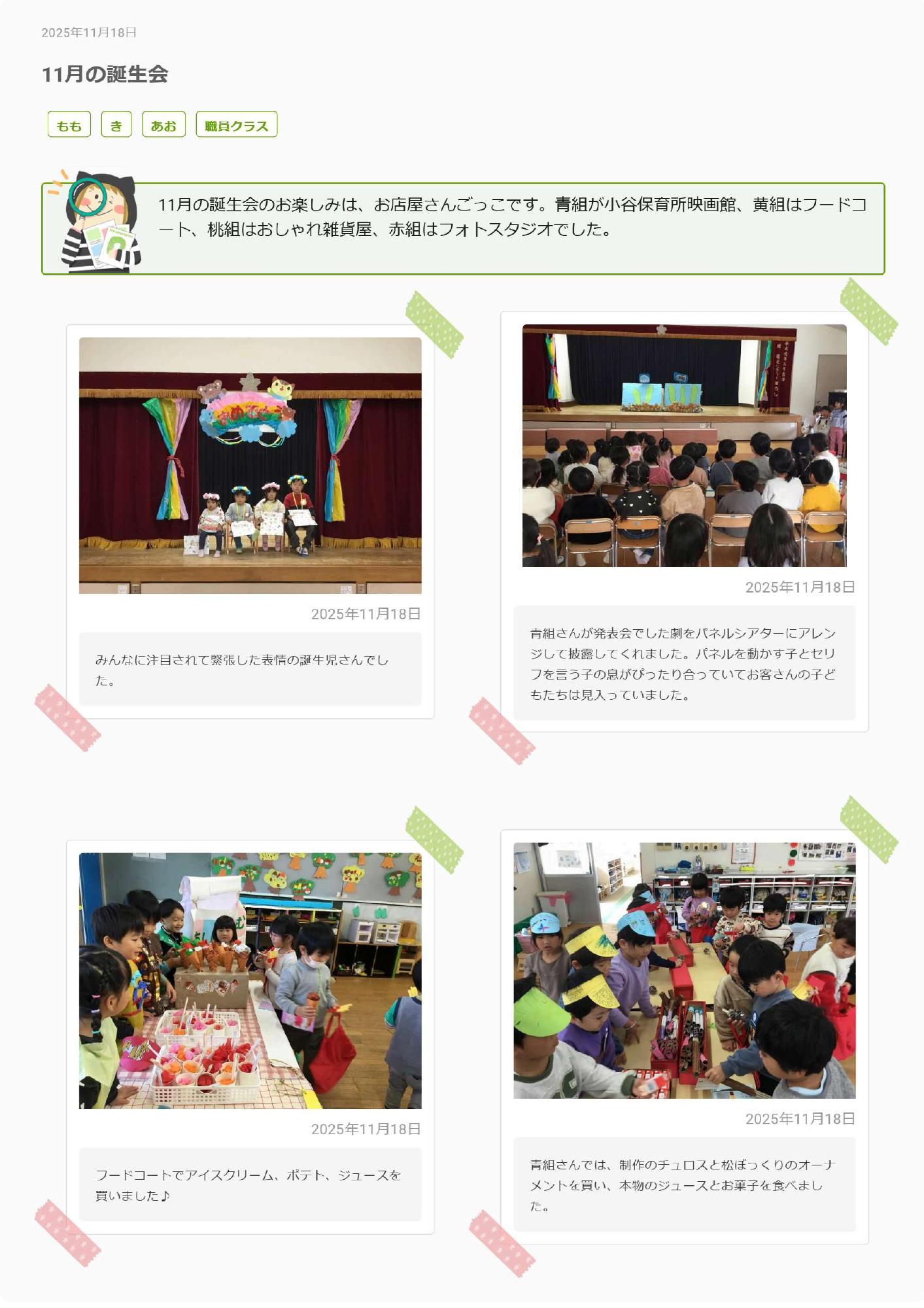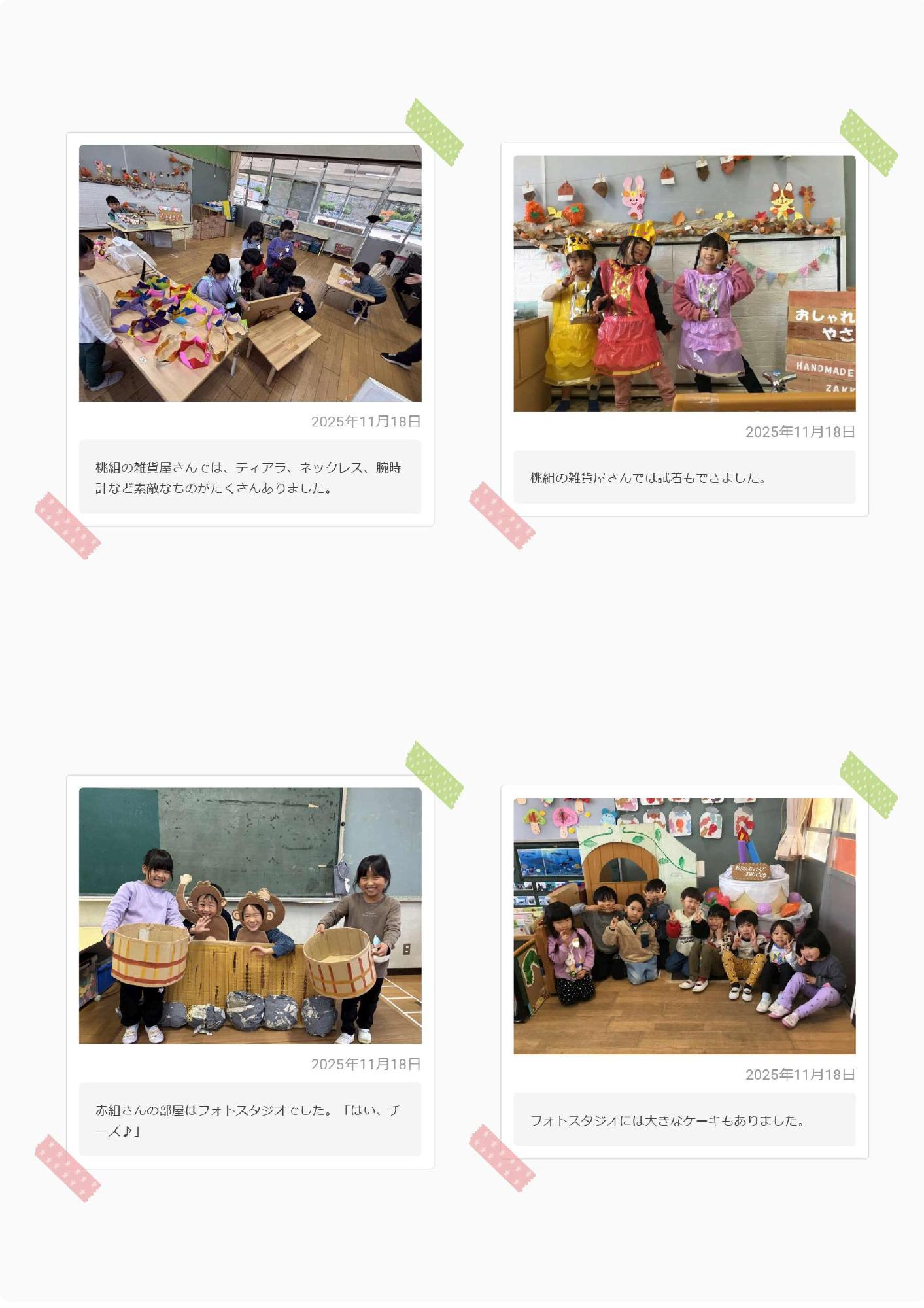 今日はお店屋さんごっこでした。今年は今までと取り組み方を変え、子どもたちの「やりたい」という自発的な姿を大切にお店屋さんごっこをすすめてきました。幼児組は子どもたちの興味のあることからお店を計画し心から楽しめるように、乳児組はお客さんになってやりたいという気持ちが育っていくように、それぞれ今日という日を迎えました。子どもたちはやっぱり遊びの天才!子どもたちの展開するお店はどれも魅力的で、みんな目がキラキラ輝いていましたよ。ぜひお話聞いてみてくださいね。