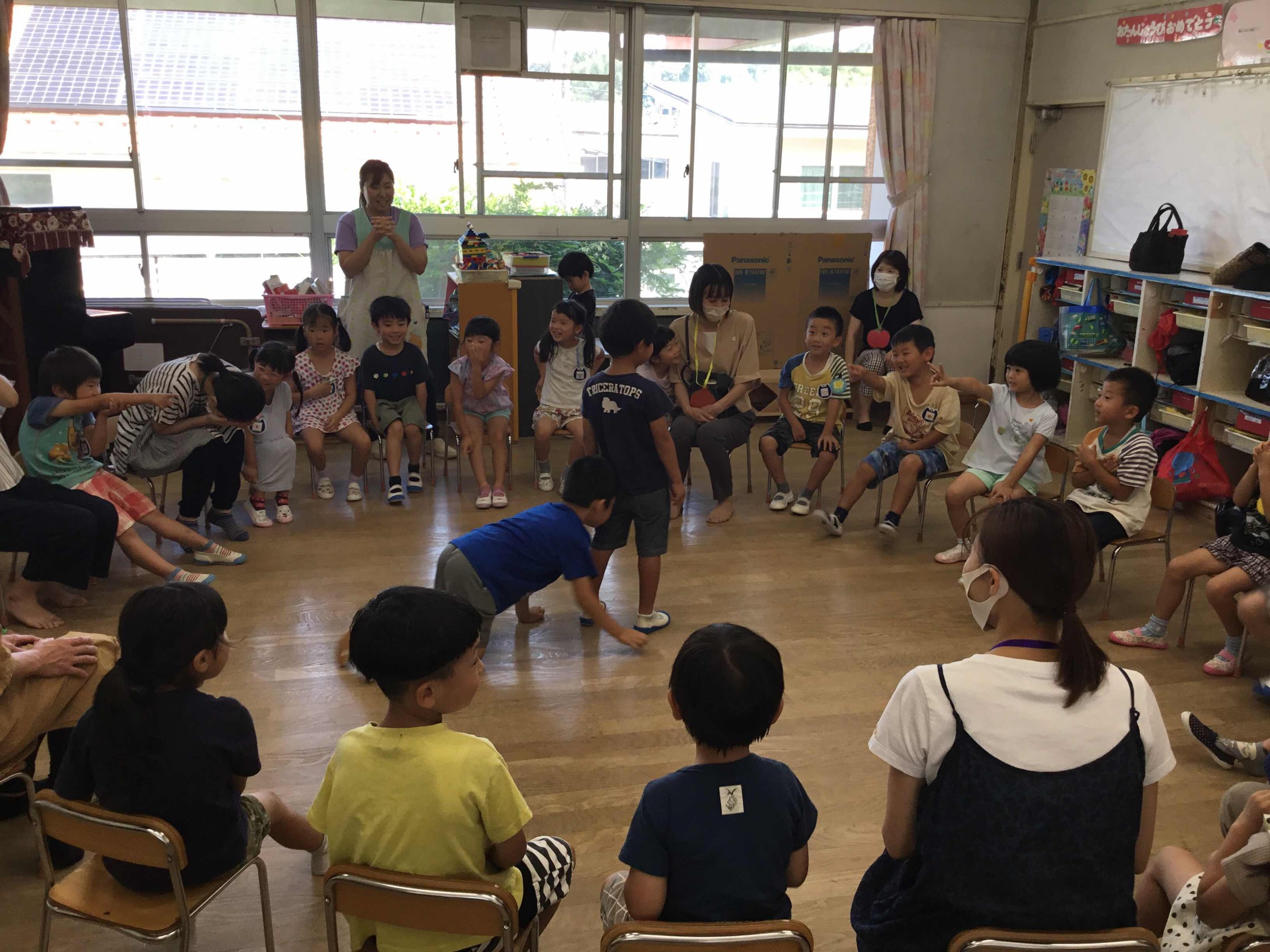 友達のおうちの人とも楽しんだ1週間。水を掛け合って遊んだり、絵本の読み聞かせをしてもらったりと、とっても楽しい日が続きました。外が暑くて水遊びができない日には、室内でフルーツバスケットが盛り上がりました。「大人は3回で負けだよ〜」「ママが負けたけど僕が代わってあげる!」とたくさん会話が聞こえてきました。ウィークが終わった今も「またフルーツバスケットしたいな〜」と声をあげる子どもたちです。