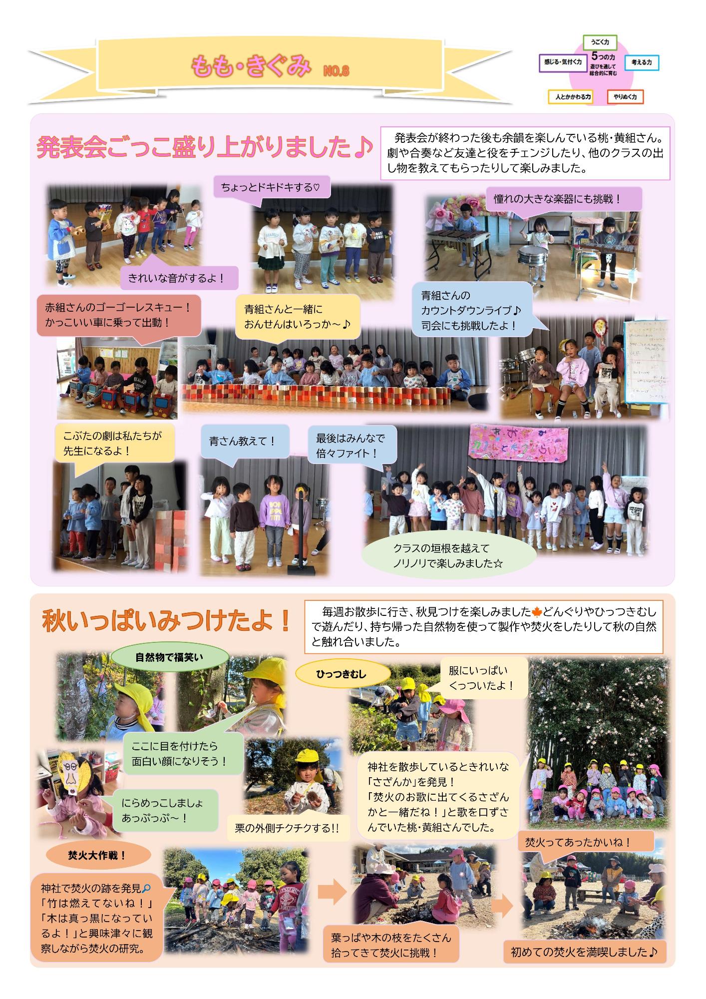 桃組(3歳児)・黄組(4歳児) Tweet 更新日:2025年11月26日 11月の子どもの姿 10月の子どもの姿 9月の子どもの姿 8月の子どもの姿 7月の子どもの姿 6月の子どもの姿 5月の子どもの姿 4月の子どもの姿