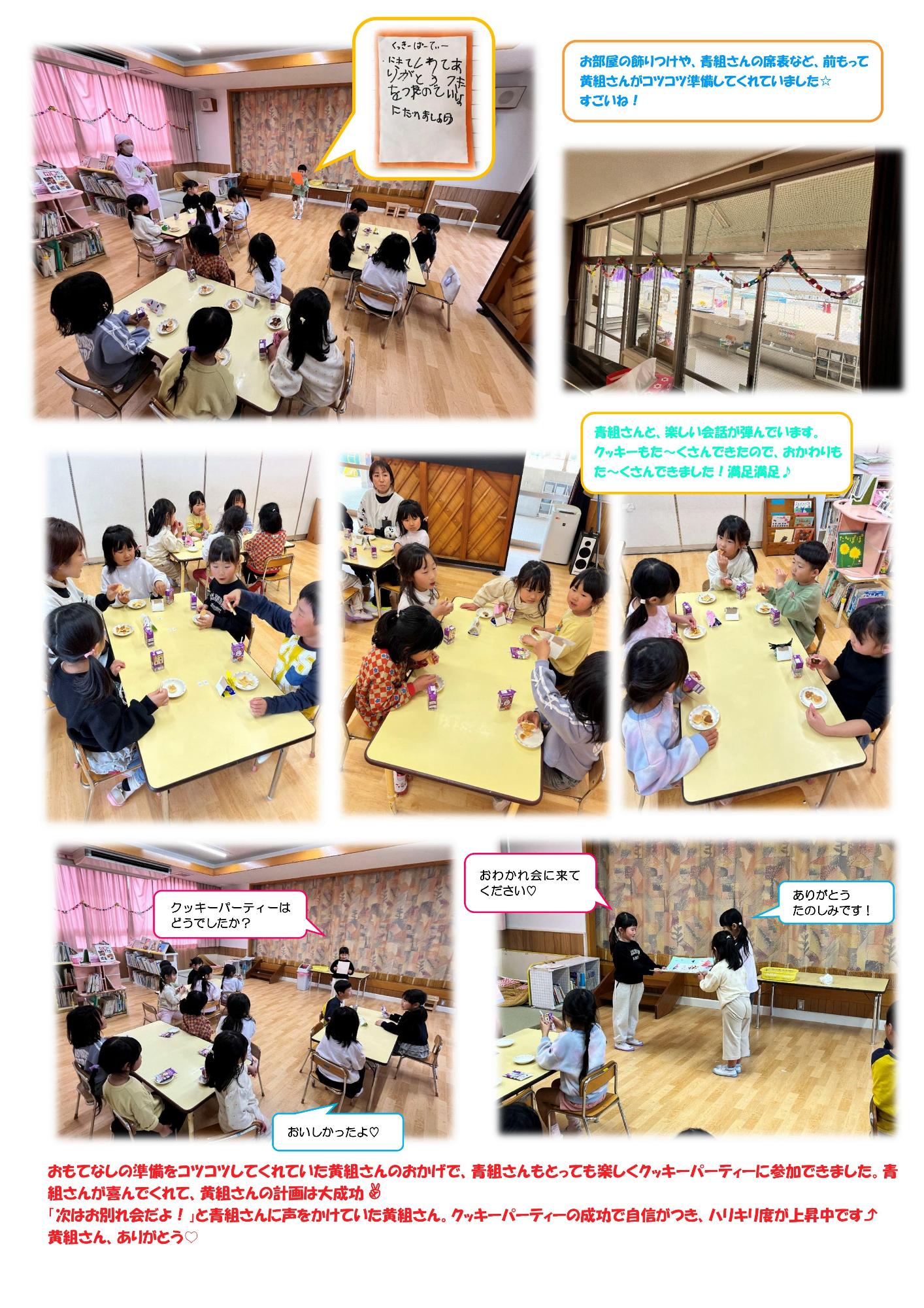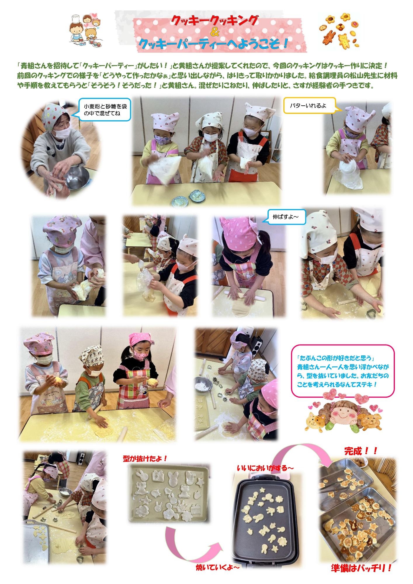 楽しい食育活動 Tweet 更新日:2026年03月09日 クッキークッキング&クッキーパーティー🍪 干し大根の収穫 干し大根づくり 🍢おでんクッキング 🍞パンづくり🥐 うどんクッキング 漁協による食育教室🐟 クッキークッキング🍪 🍉すいかができたぞ~! 夏野菜を使ってピザクッキング🍕 みんなでカレークッキング🍴 大きなサツマイモになぁれ☆ みんなで収穫楽しいね! 🌾田植えをしたよ! キャベツとチーズのおやきクッキング