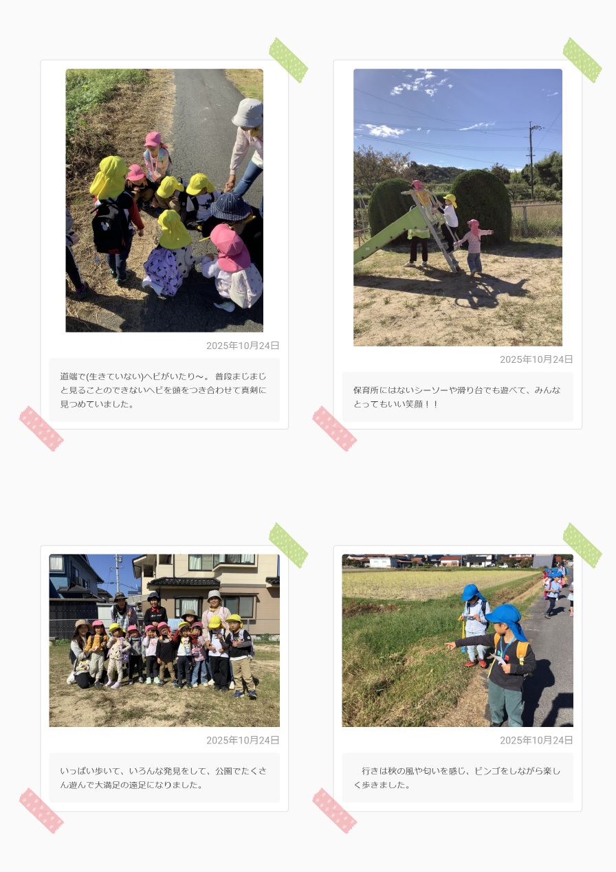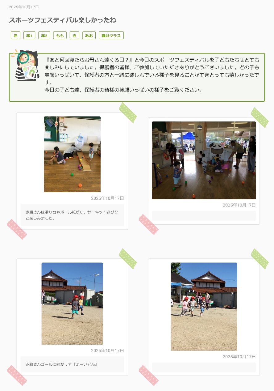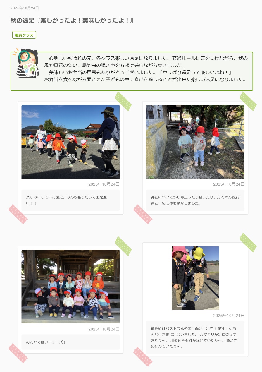 年間行事 Tweet 更新日:2025年10月24日 秋の遠足『楽しかったよ!美味しかったよ!』 スポーツフェスティバル楽しかったね 春の遠足 またきてね ~黒瀬中学校保育実習~ 【ほいくさんか】いかがでしたか? スポーツフェスティバルに向けて ~最終章~ スポーツフェスティバルに向けて ~第2章~ スポーツフェスティバルに向けて ~序章~ はるのえんそく 入所・進級を祝う会 4月の誕生会
