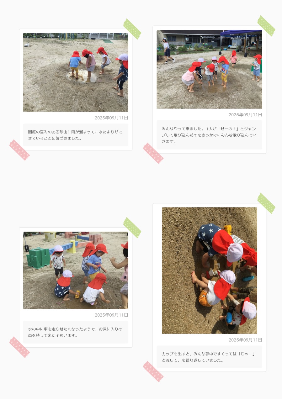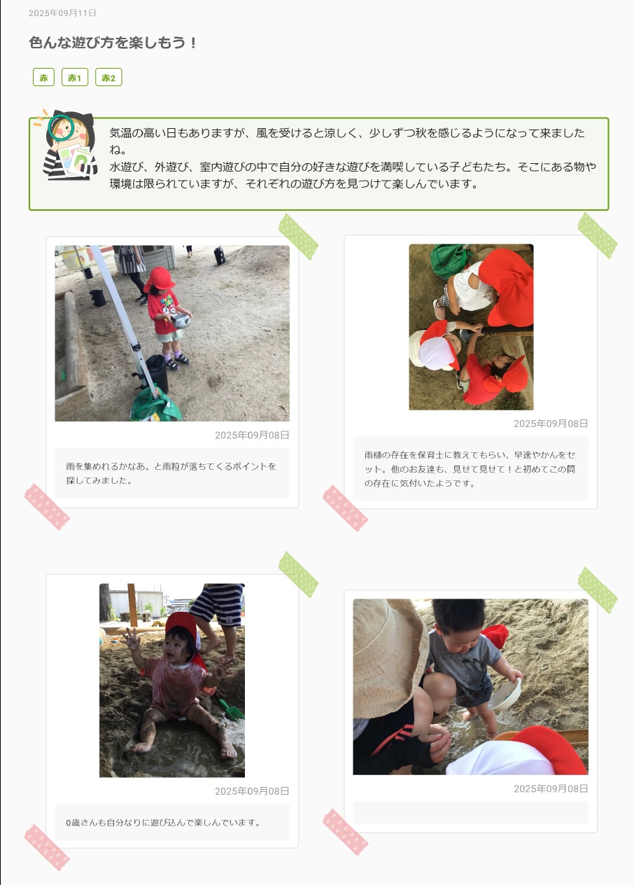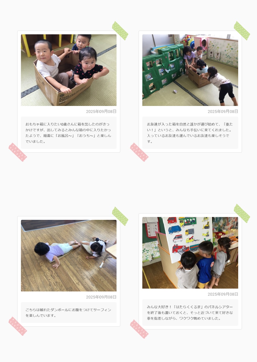 赤組(0・1・2歳児) Tweet 更新日:2025年10月08日 色んな遊び方を楽しもう! 楽しい水遊び ごっこ遊び楽しいな お外って気持ちいいな サロンに行ったよ 照れちゃった 楽しい秋、み~つけた! 不思議なことがいっぱい! 夏を楽しもう! 5感で感じよう 春の遠足 赤組のおともだち