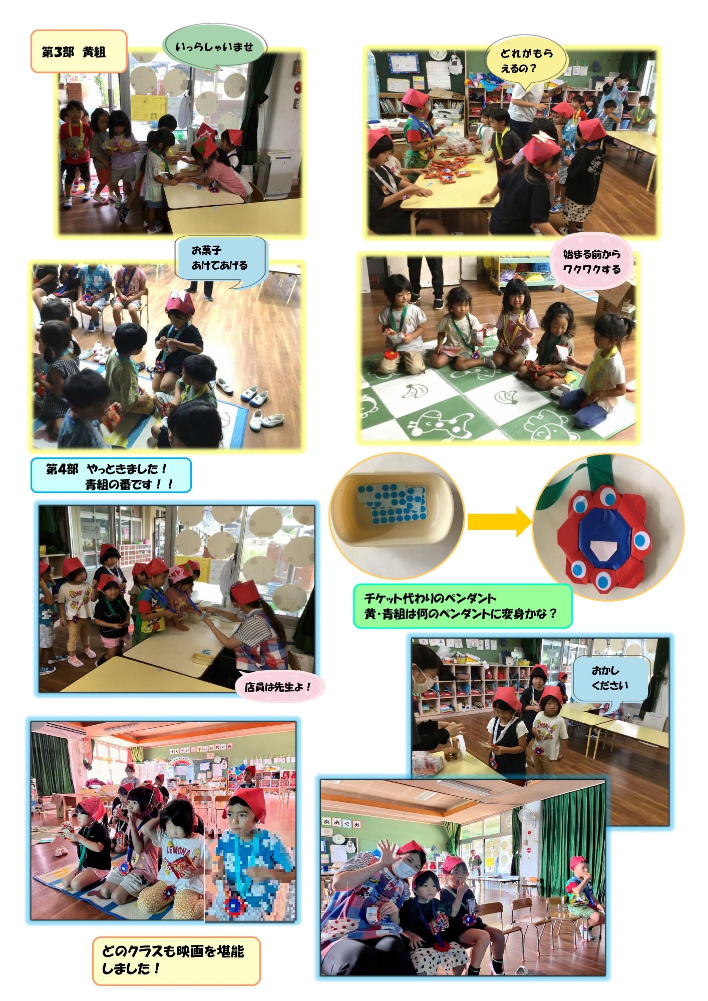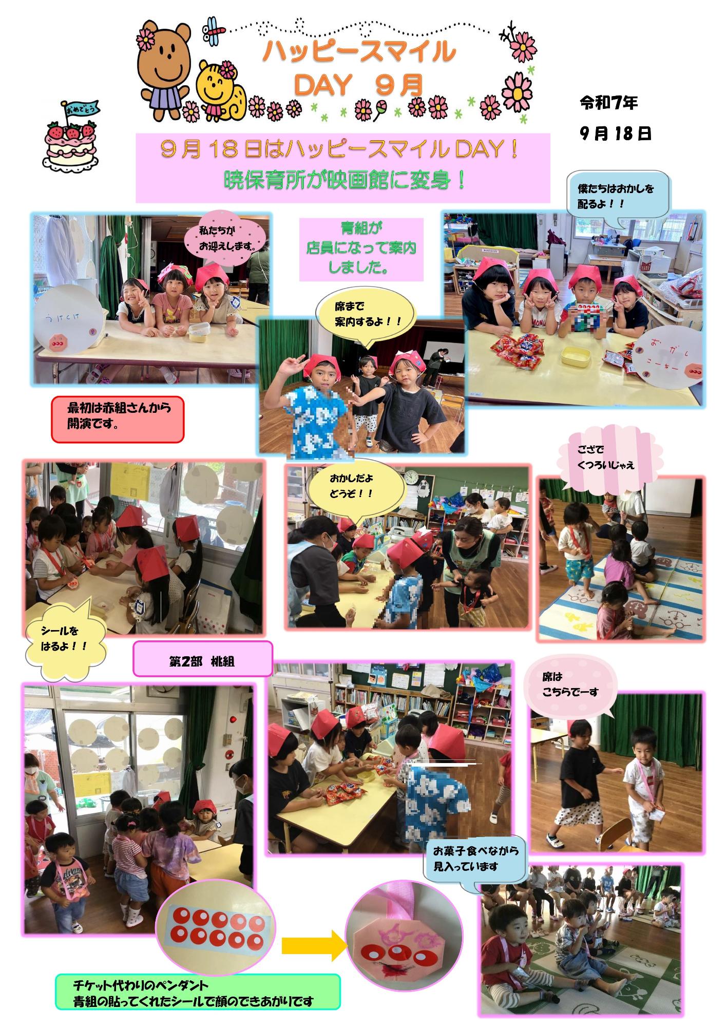 9月のハッピースマイルDAYは、暁保育所が映画館に変身しました。青組さんが会場スタッフになって大活躍でした。