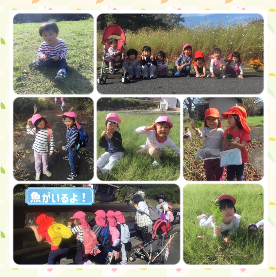 赤組さんと桃組さんが、秋の遠足に行きました。こども園の周りには自然がいっぱい!ススキや赤く色づいた葉っぱも子どもたちには宝物。