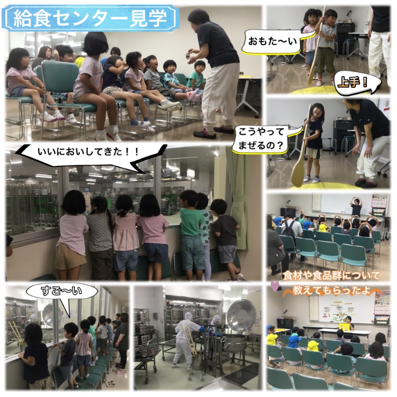 こども園の給食は、福富町にある北部給食センターで作られています。実際に使われているものと同じ調理器具に触れたり、給食を作っている様子を見たりする中で、その大きさや重たさにビックリ!改めて、調理員さんに感謝しながら給食をいただきました。