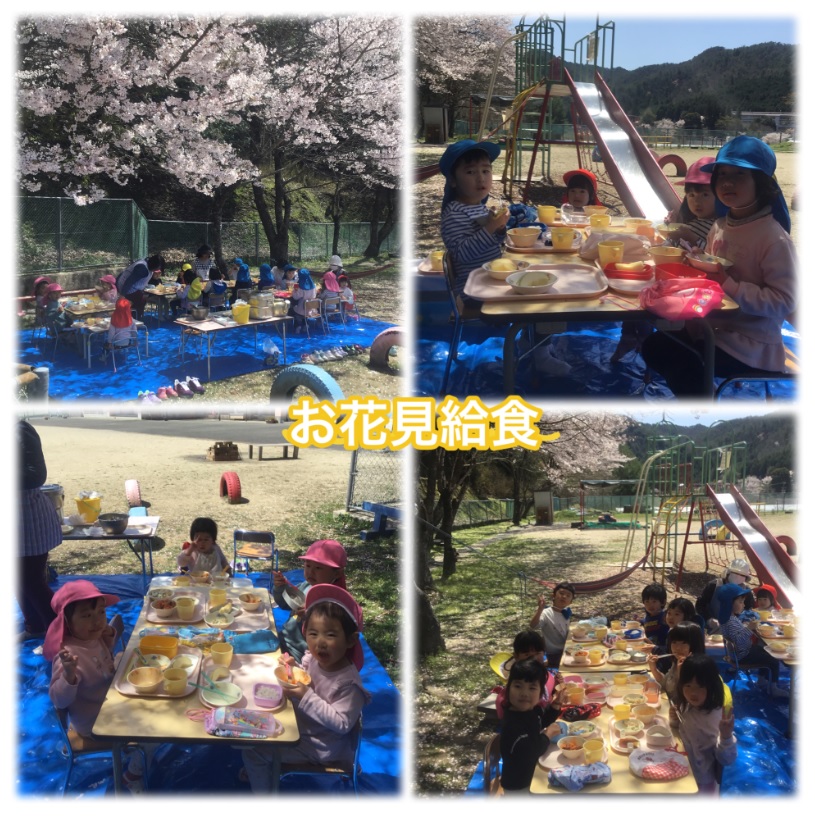 「認定こども園たけに」には大きな桜の木があり、毎年満開の桜の木の下でお花見給食をしています。子ども達が食べていると「ピュー」っと風が吹き、ごはんの上に花びらが!すると「さくらご飯だね」と嬉しそうな子どもたちでした。