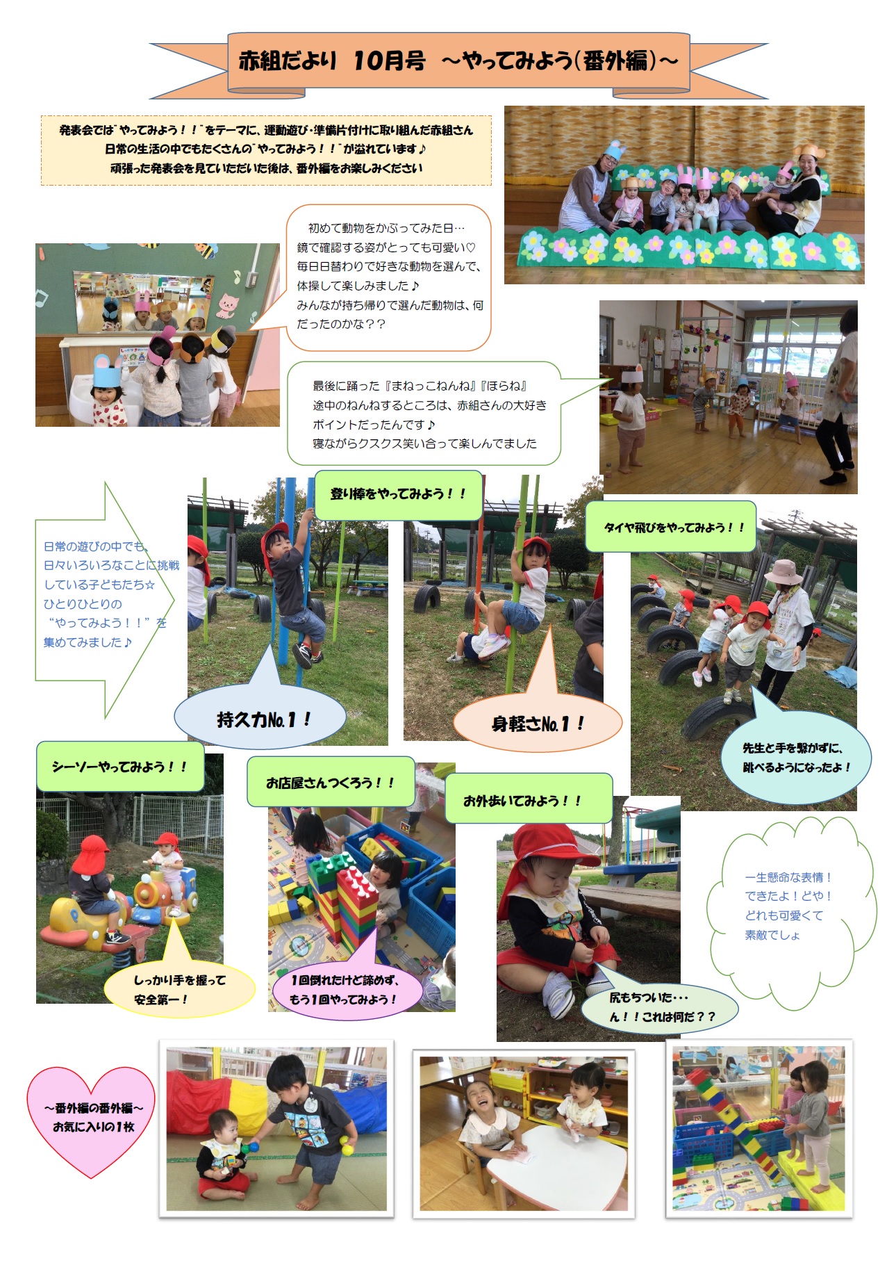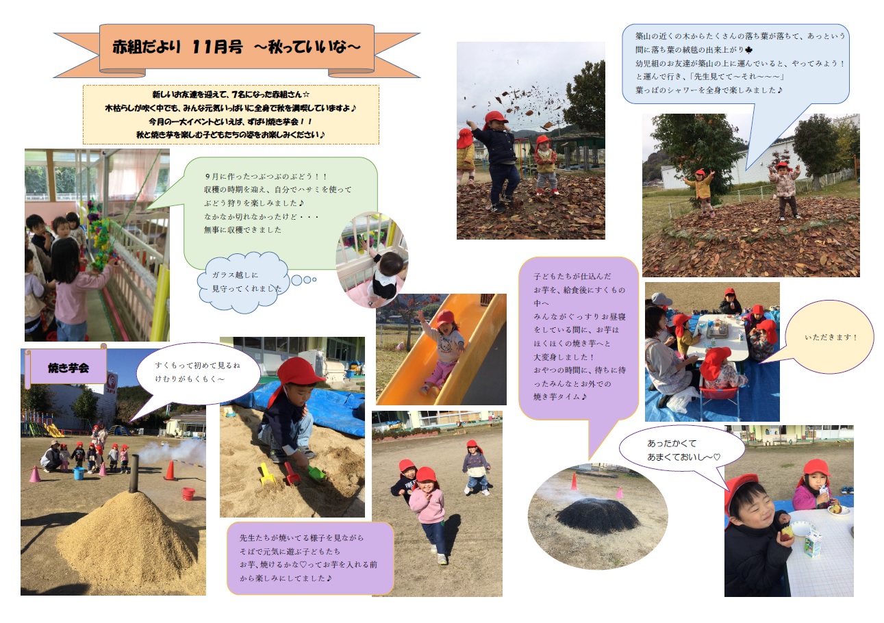 赤組 Tweet 更新日:2025年12月26日 12月号~わくわくいっぱい~ 11月号~秋っていいな~ 10月号~やってみよう(番外編)~ 9月号~製作の秋~ 8月号~とよさか夏まつり~ 7月号~夏っていいな~ 6月号 ~新聞紙で遊ぼう~ 5月号 ~みんなで大変身~ 4月号 ~春っていいな~