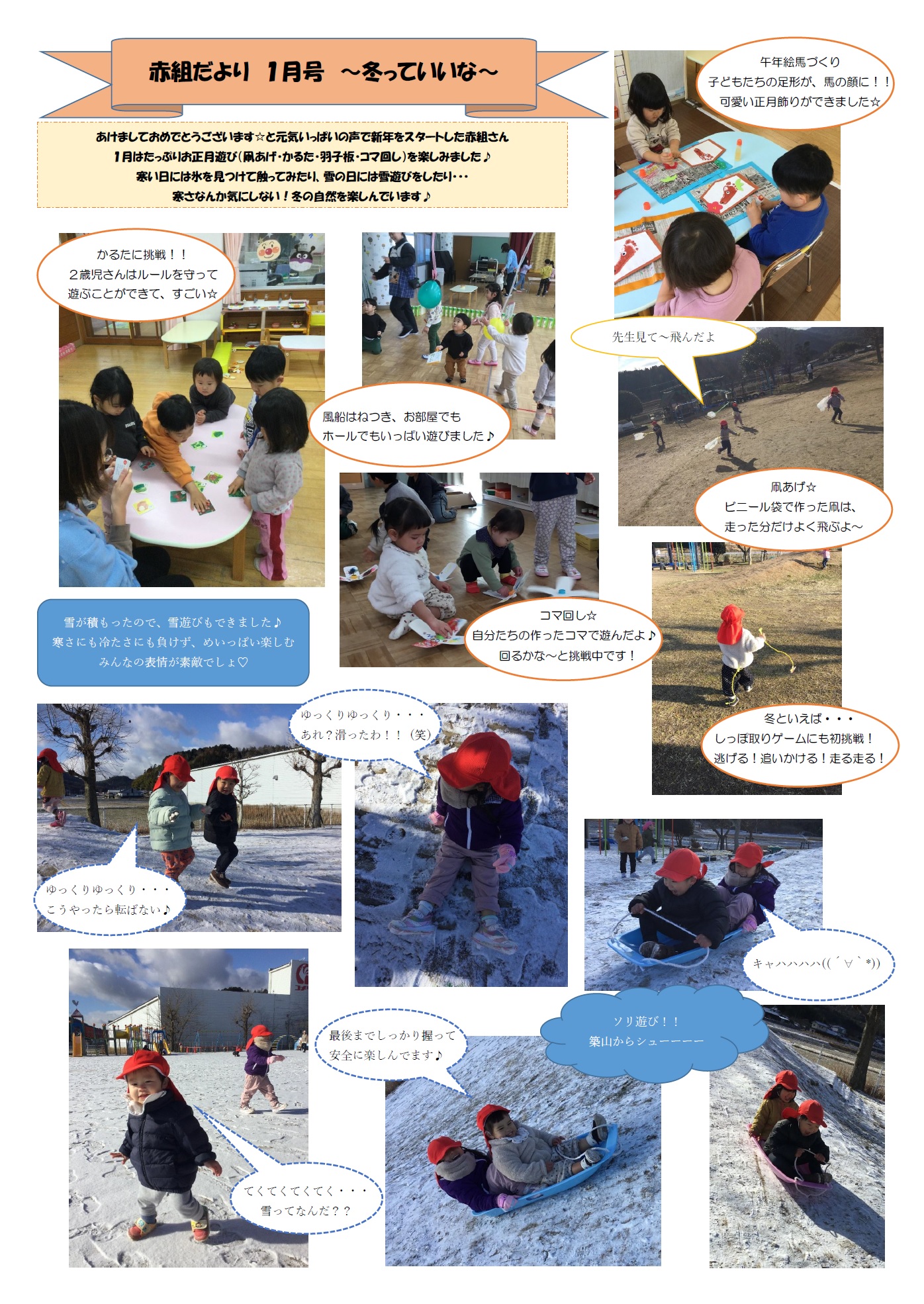 赤組 Tweet 更新日:2026年02月06日 1月号~冬っていいな~ 12月号~わくわくいっぱい~ 11月号~秋っていいな~ 10月号~やってみよう(番外編)~ 9月号~製作の秋~ 8月号~とよさか夏まつり~ 7月号~夏っていいな~ 6月号 ~新聞紙で遊ぼう~ 5月号 ~みんなで大変身~ 4月号 ~春っていいな~