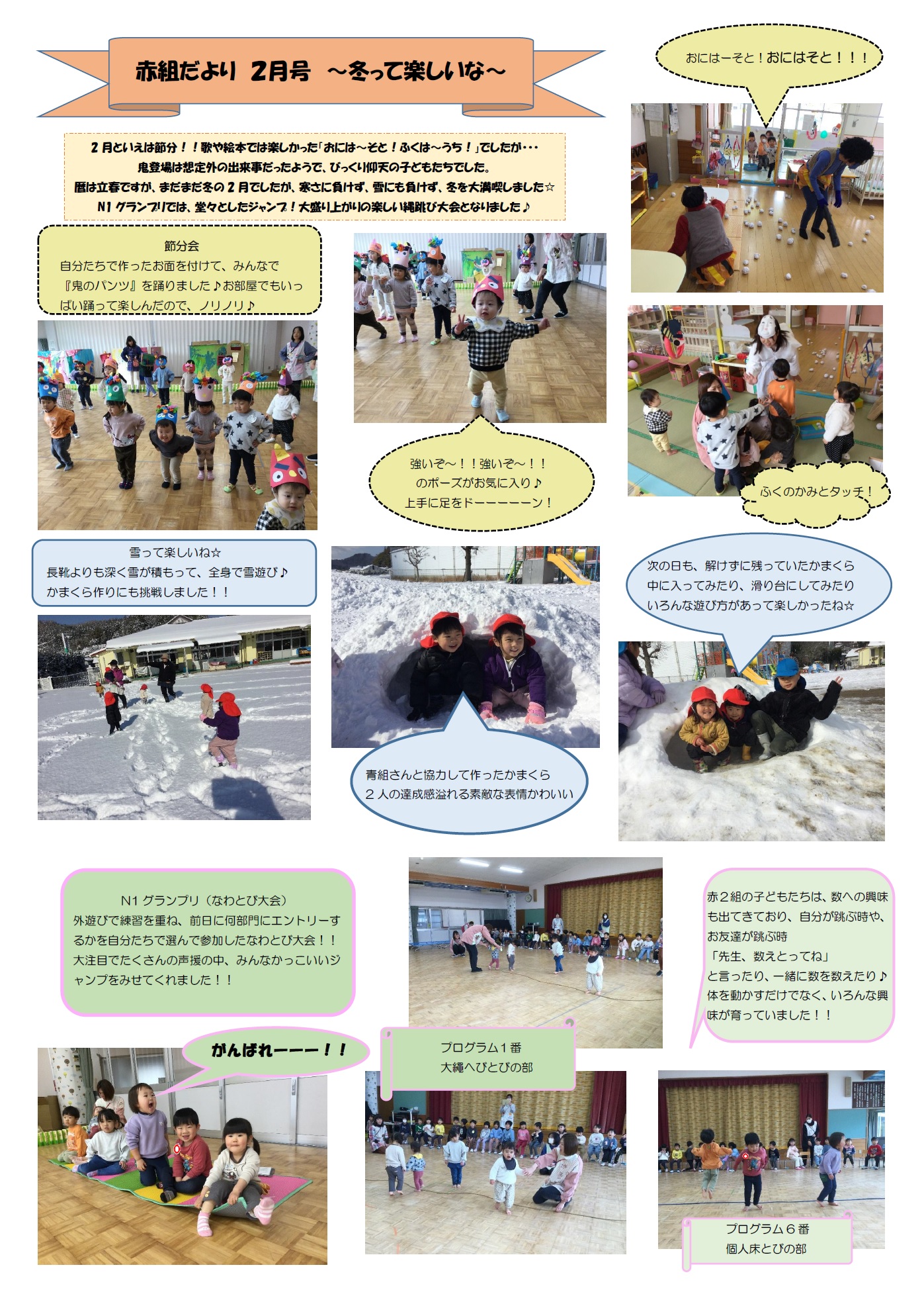 赤組 Tweet 更新日:2026年03月09日 2月号~冬って楽しいな~ 1月号~冬っていいな~ 12月号~わくわくいっぱい~ 11月号~秋っていいな~ 10月号~やってみよう(番外編)~ 9月号~製作の秋~ 8月号~とよさか夏まつり~ 7月号~夏っていいな~ 6月号 ~新聞紙で遊ぼう~ 5月号 ~みんなで大変身~ 4月号 ~春っていいな~