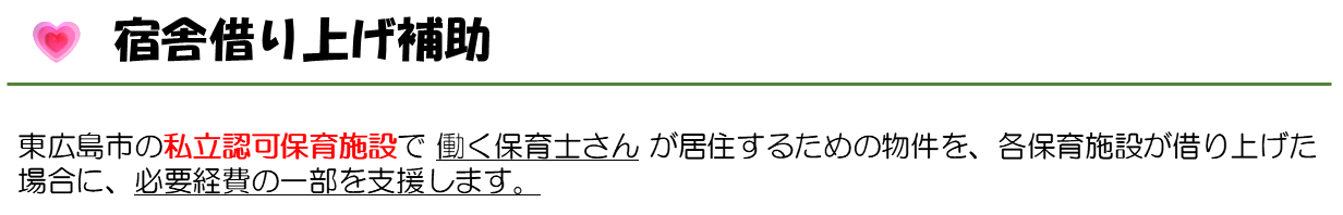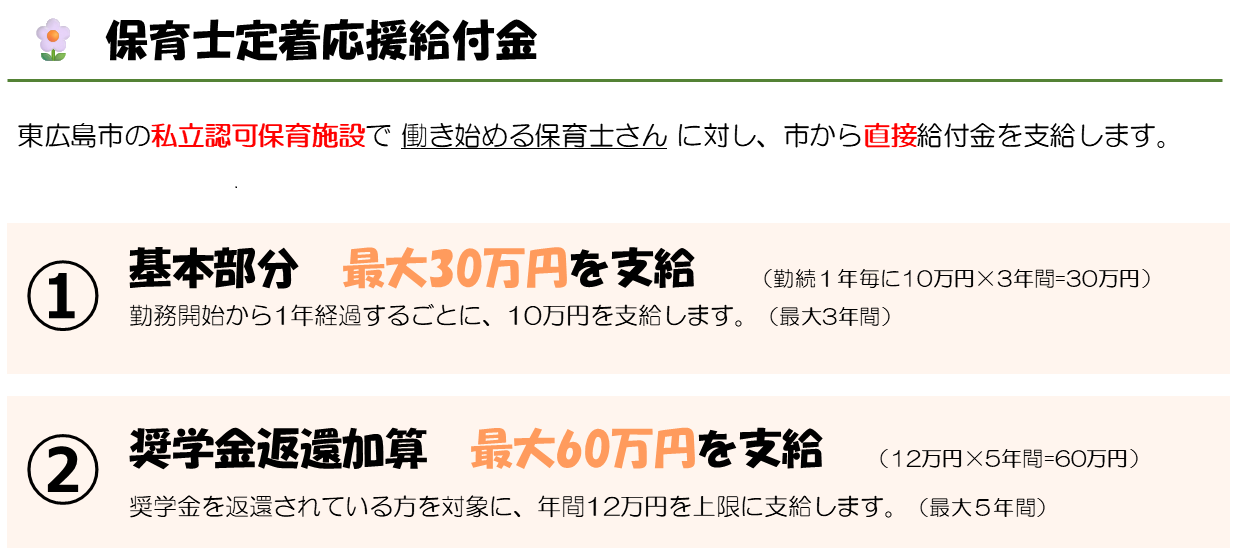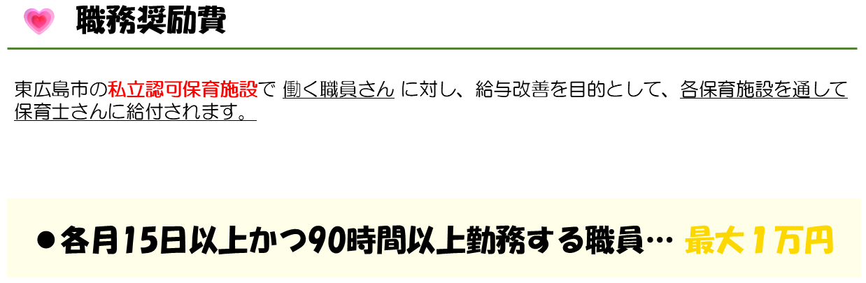- 保育士するなら東広島応援給付金及び当該給付金を受けたことがないこと。