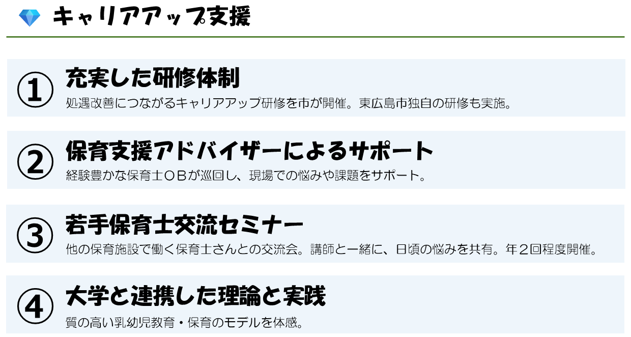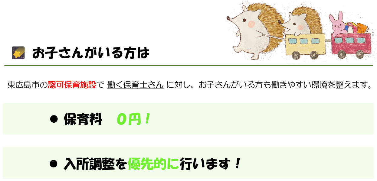 - 東広島市の認可保育施設に、保育士または保育教諭として任用されていること。