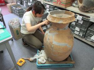 東広島市高屋町の中島1号遺跡で出土した弥生時代後期の土器棺(大型の壺)を復原しました(平成26年度)。