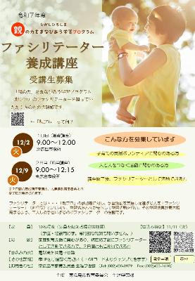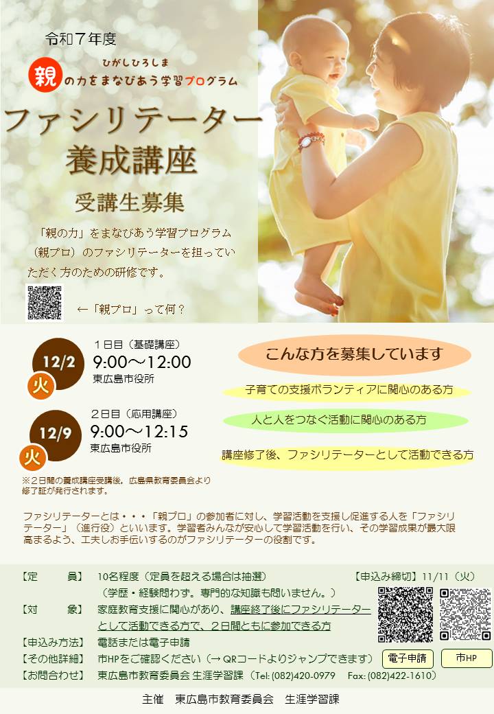 「『親の力』をまなびあう学習プログラム」ファシリテーター養成講座を実施します。 広島県の家庭教育支援事業『「親の力』をまなびあう学習プログラム(親プロ)を推進し、東広島市で本プログラムを活用した講座を企画・運営していただくファシリテーターを養成するための講座です。本講座修了者には広島県立生涯学習センターより修了証が発行され、本市の親プロファシリテーターとして登録されます。 ★「『親の力』をまなびあう学習プログラム(親プロ)につきましては広島県教育委員会ホームページをご確認ください。 https://www.pref.hiroshima.lg.jp/site/center/kateikyouiku-oyapuro.html ★本市の親プロ活用講座につきましては、以下のHPをご覧ください。 |