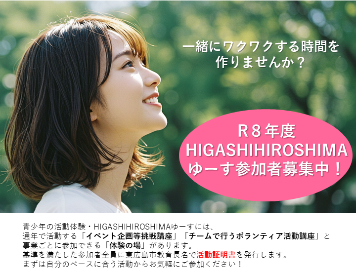■対象:東広島市内に在住、または通学する中学生、高校生 ■締切:令和8年4月30日(木曜日) ■定員:各30名程度※希望者多数の場合は、抽選 ■当選のみ郵送にて結果を通知します。(5月上旬は発送予定) ■当選通知と一緒に承諾書を同封します。 必ずご一読いただき、保護者の署名をお願いします。 承諾書は初回実施時に持参してください。 ■初回実施日は、5月中の土日を予定しています。 詳細及びそれ以降の日程は決定次第市HPで公開します。 |