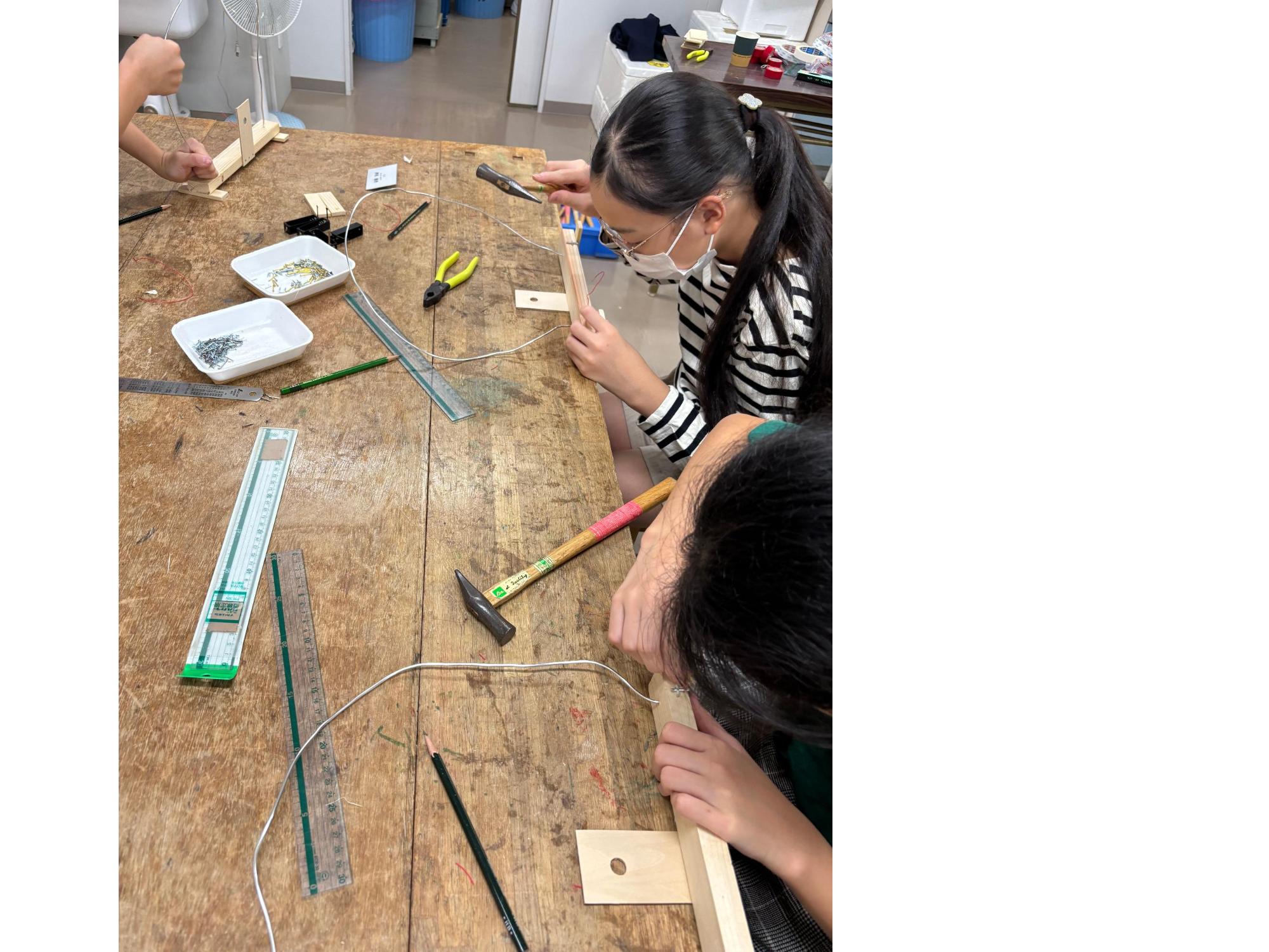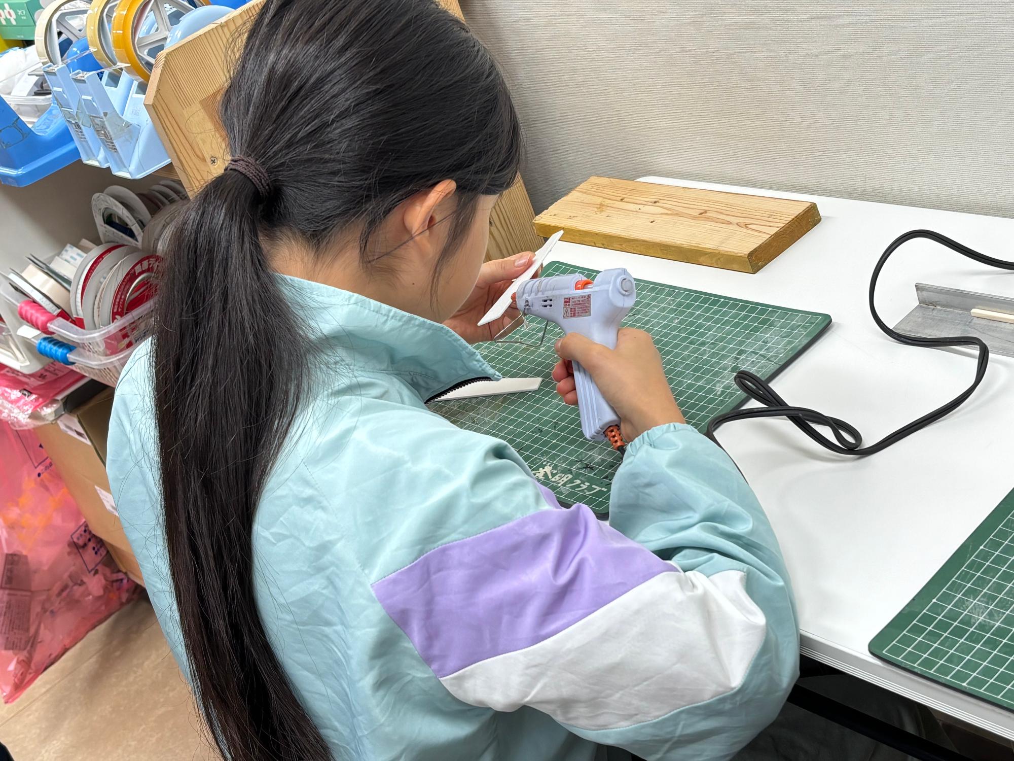 ラジオペンチやグルーガンを使って各パーツを組み立て、動力となる輪ゴムでプロペラ部分を固定して作ることで、メカニズムの仕組みを体感。