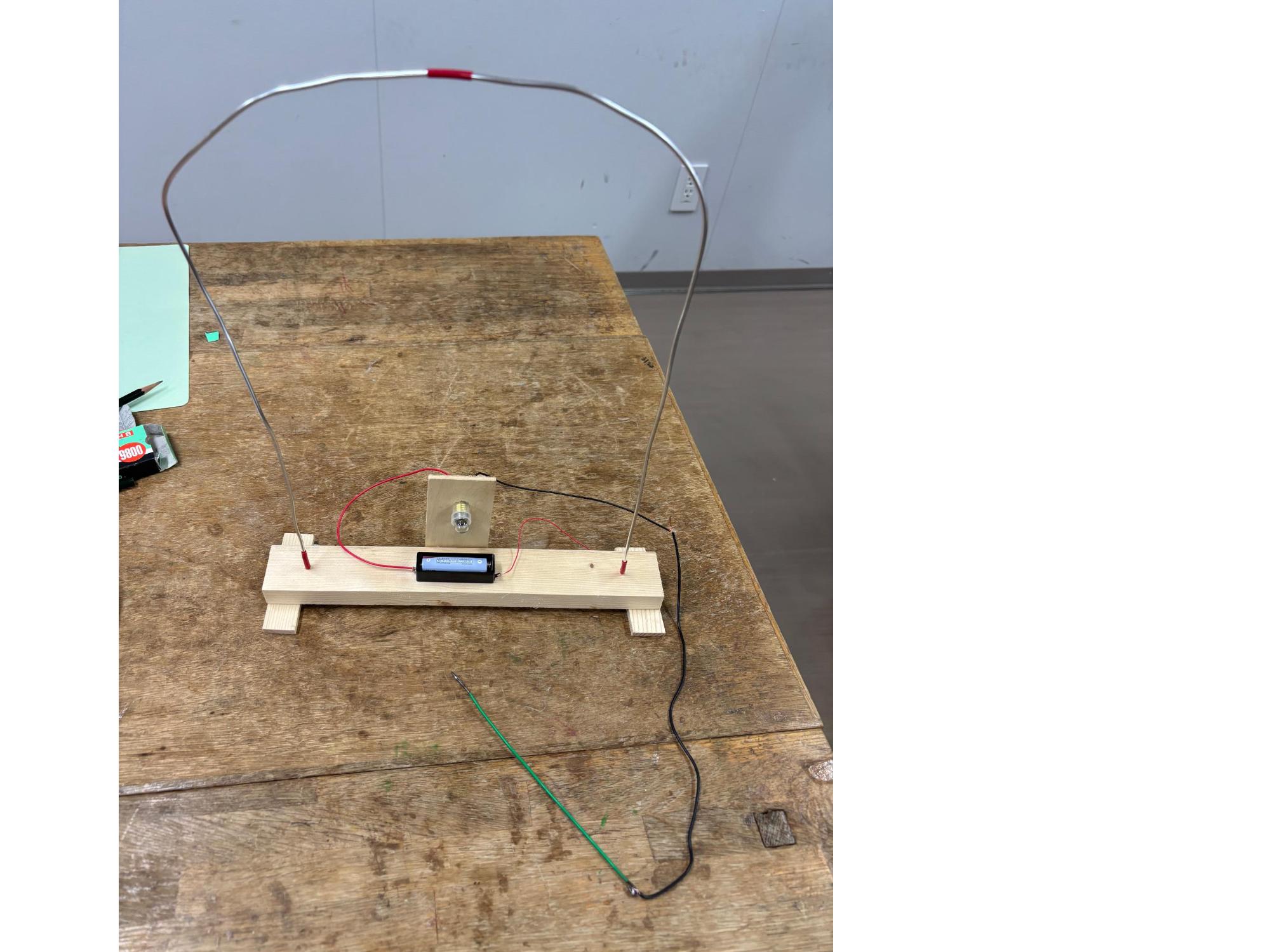 長い針金で作ったコースにイライラ棒を通すゲームで、棒が針金に触れると電気が通り、豆電球が点灯する仕組みです。