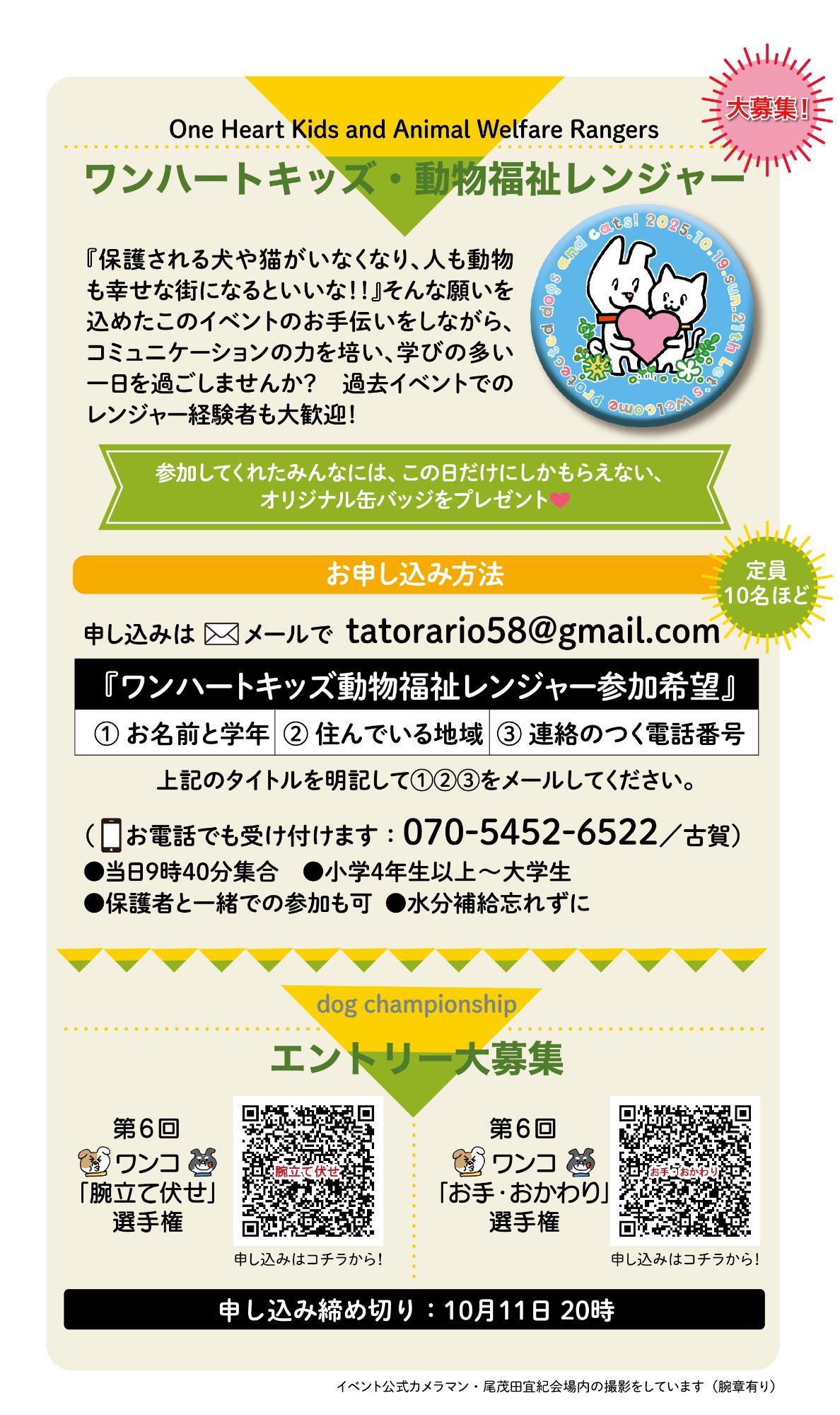 1.ワンハートキッズ動物福祉レンジャー参加希望 参加希望者は (1)お名前と学年 (2)お住まいの地域 (3)連絡のつくお電話番号 を明記して、メール(tatorairo@gmail.com)もしくはお電話(070-5452-6522 古賀)でお申し込みください。 ※当日は9時40分集合となります。 ※小学4年生以上~大学生を対象としています。 ※保護者同伴での参加も可能です。 ※水分補給をしっかりおこなってください。 2.ワンコ「お手・おかわり」選手権 詳細、お申込みついては下記URLより確認してください。 https://docs.google.com/forms/d/e/1FAIpQLSfT4BStmGM1SEcQunKXU8lyp0TRn3yJLU20sjbVx2WZB65GcQ/viewform お問い合わせ 070-5452-6522(古賀)