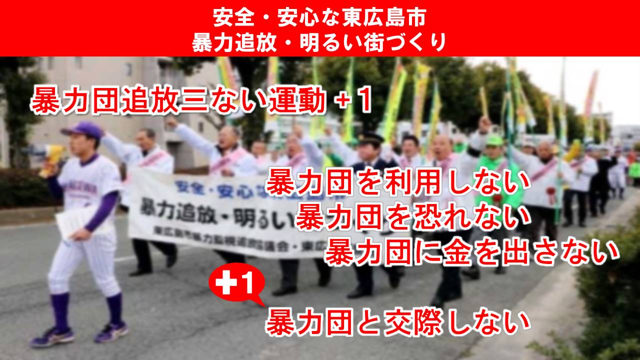 東広島市では、東広島市暴力監視追放協議会、東広島警察署、その他関係団体などと連携し、暴力団進出阻止や少年を暴力団から守る活動を強化するため、街頭パレード、少年サッカー大会、消防・防災フェアなどの活動を推進しています。